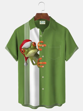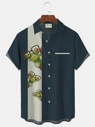 Royaura® Retro Stripe Funny Frog Print Men's Pocket Short Sleeve Shirt Big & Tall