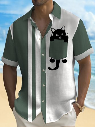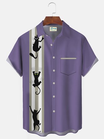 Royaura® Halloween Cat Stripe Bowling Print Men's Button Pocket Short Sleeve Shirt Big & Tall
