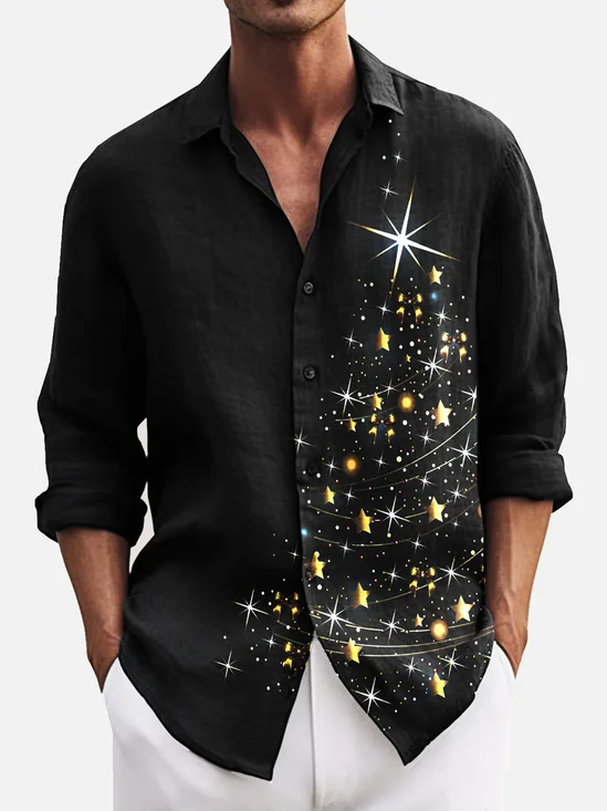 Royaura Christmas Black Men's Long Sleeve Shirts Glitter Gold Christmas Tree Stretch Oversized Button Shirts