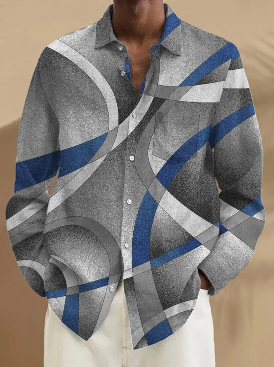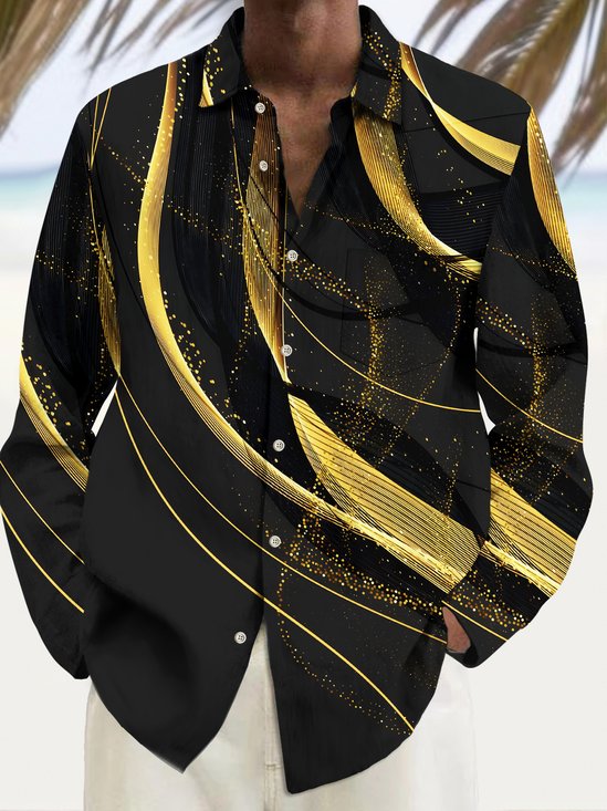 Royaura® Retro Geometric Stripe Print Men's Fashion Satin Button Long Sleeve Shirt Big & Tall
