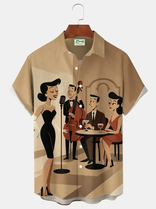 Royaura® Vintage Retro 1950s Cartoon Style Jazz Night Art Print Men's Button Pocket Short Sleeve Shirt Big & Tall