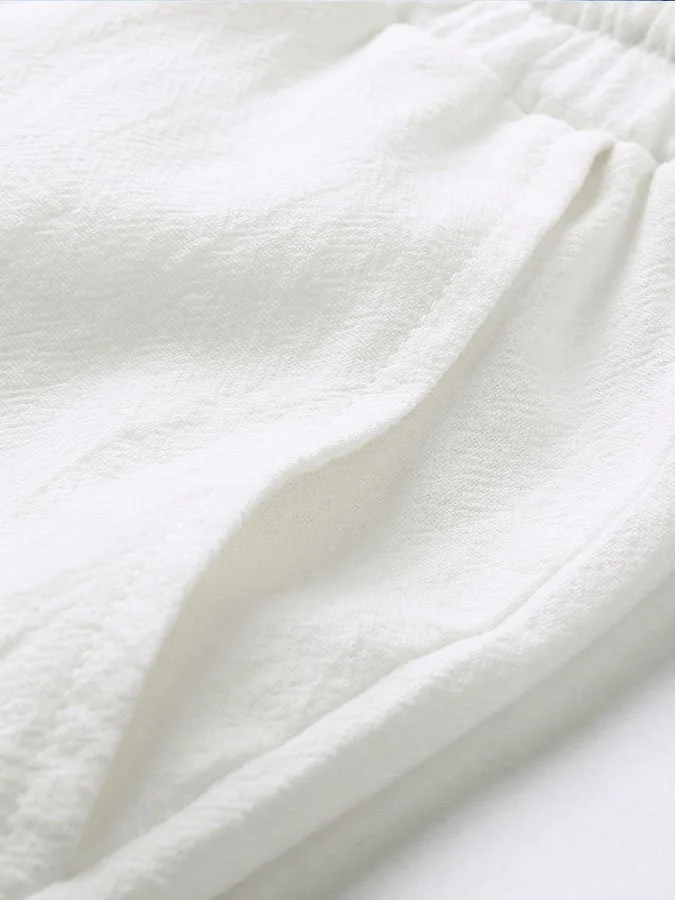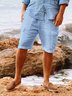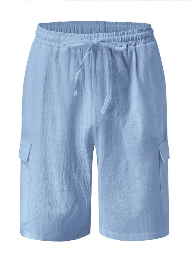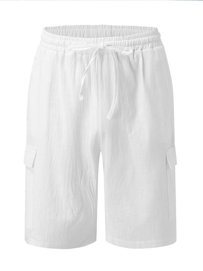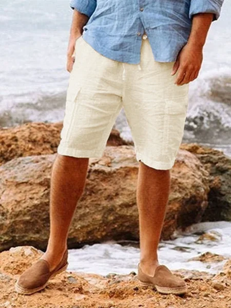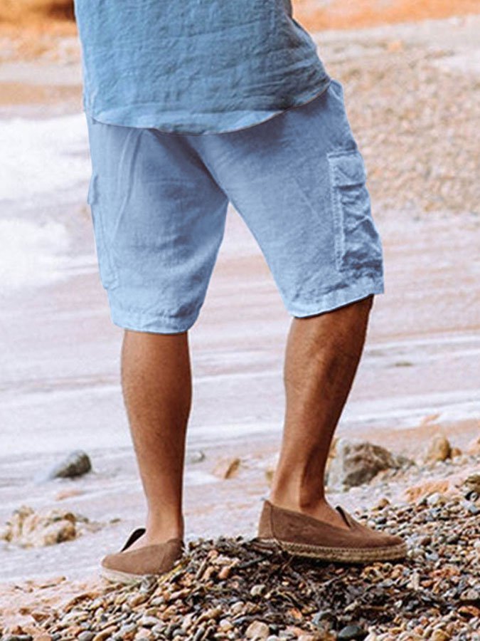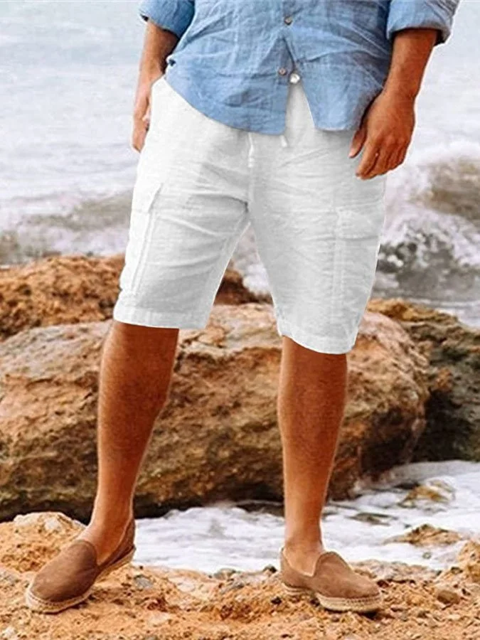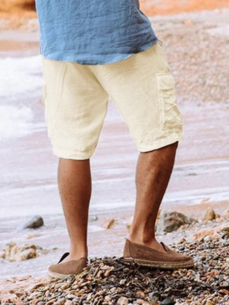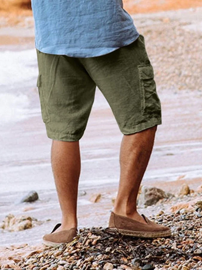 Men's Leisure Holiday Solid Color Natural Fiber Multi-Pocket Beach Cargo Shorts