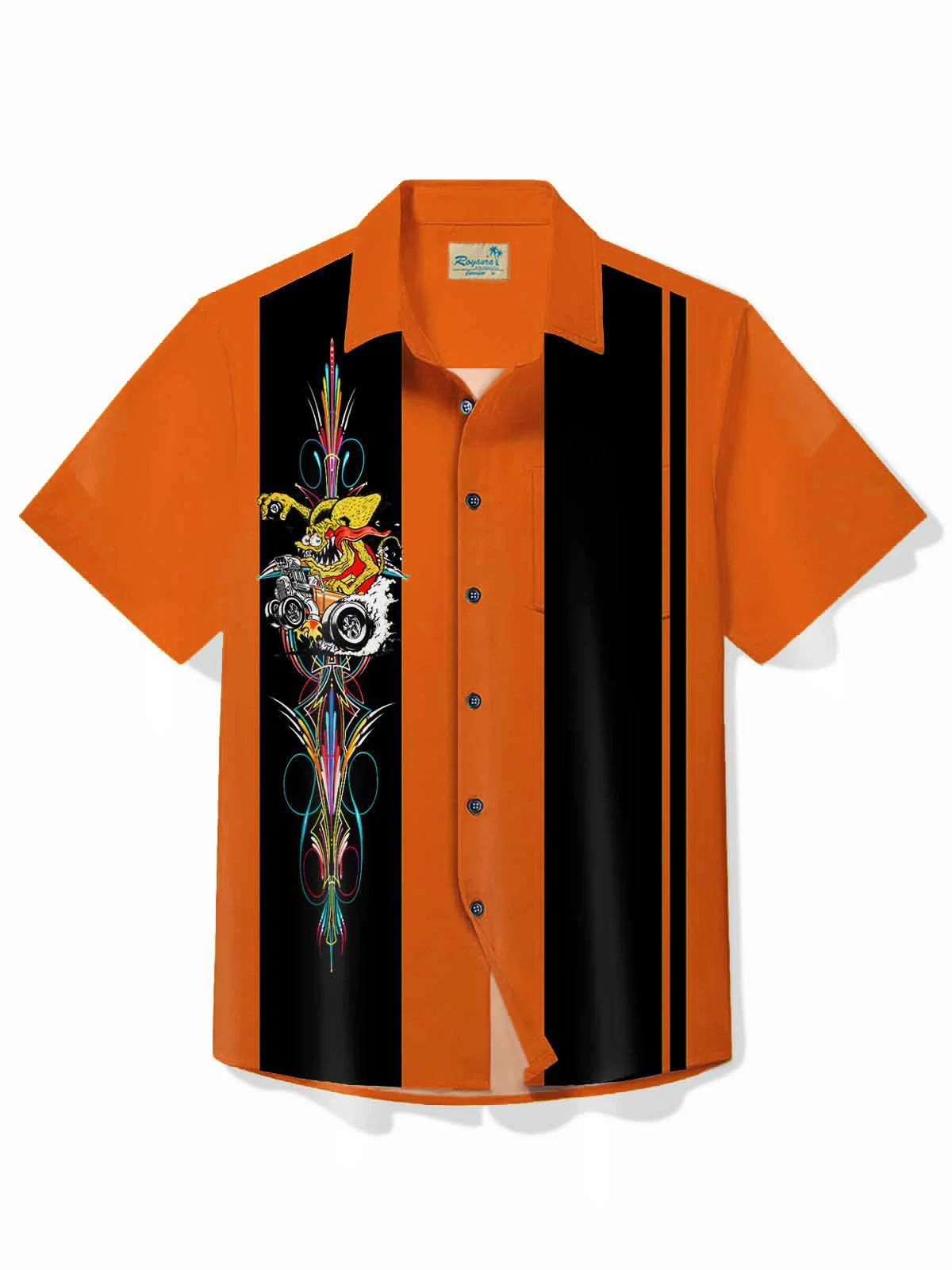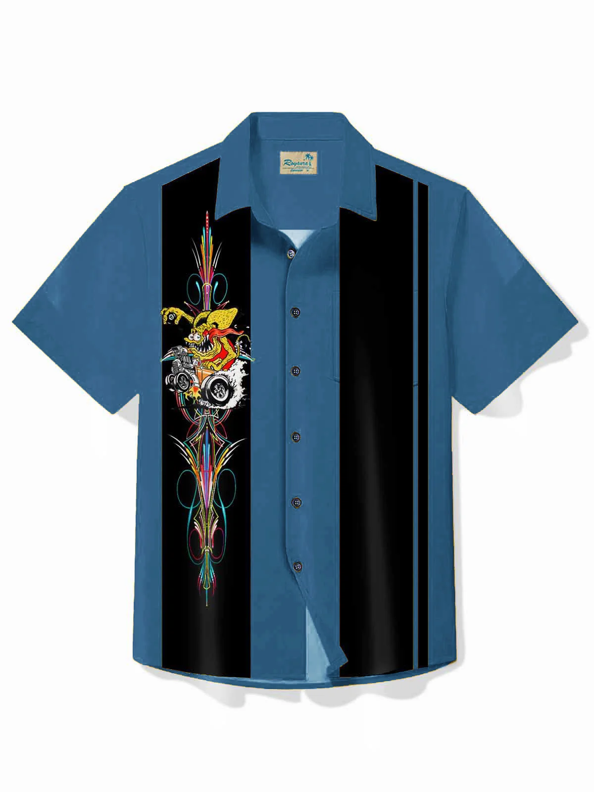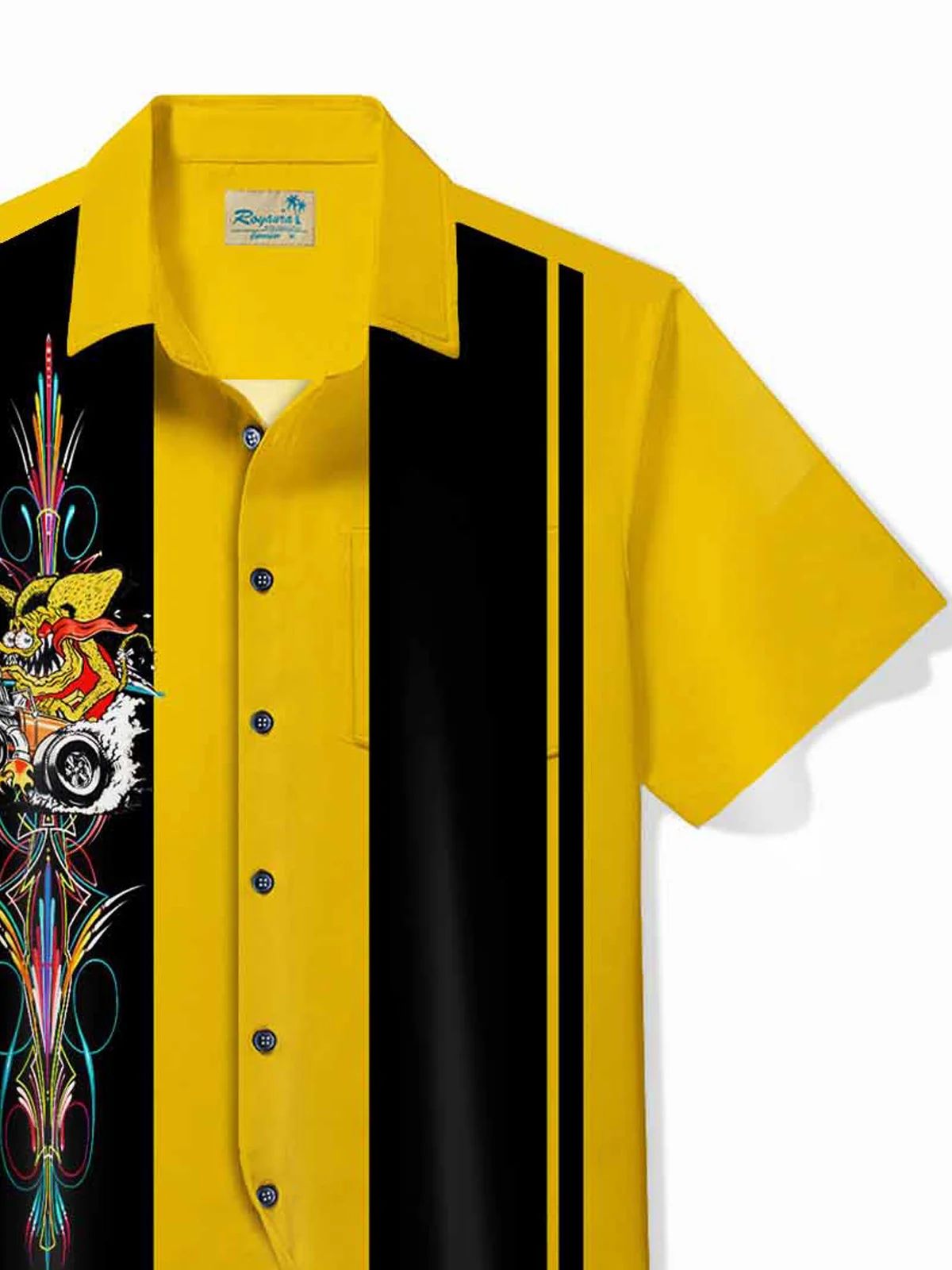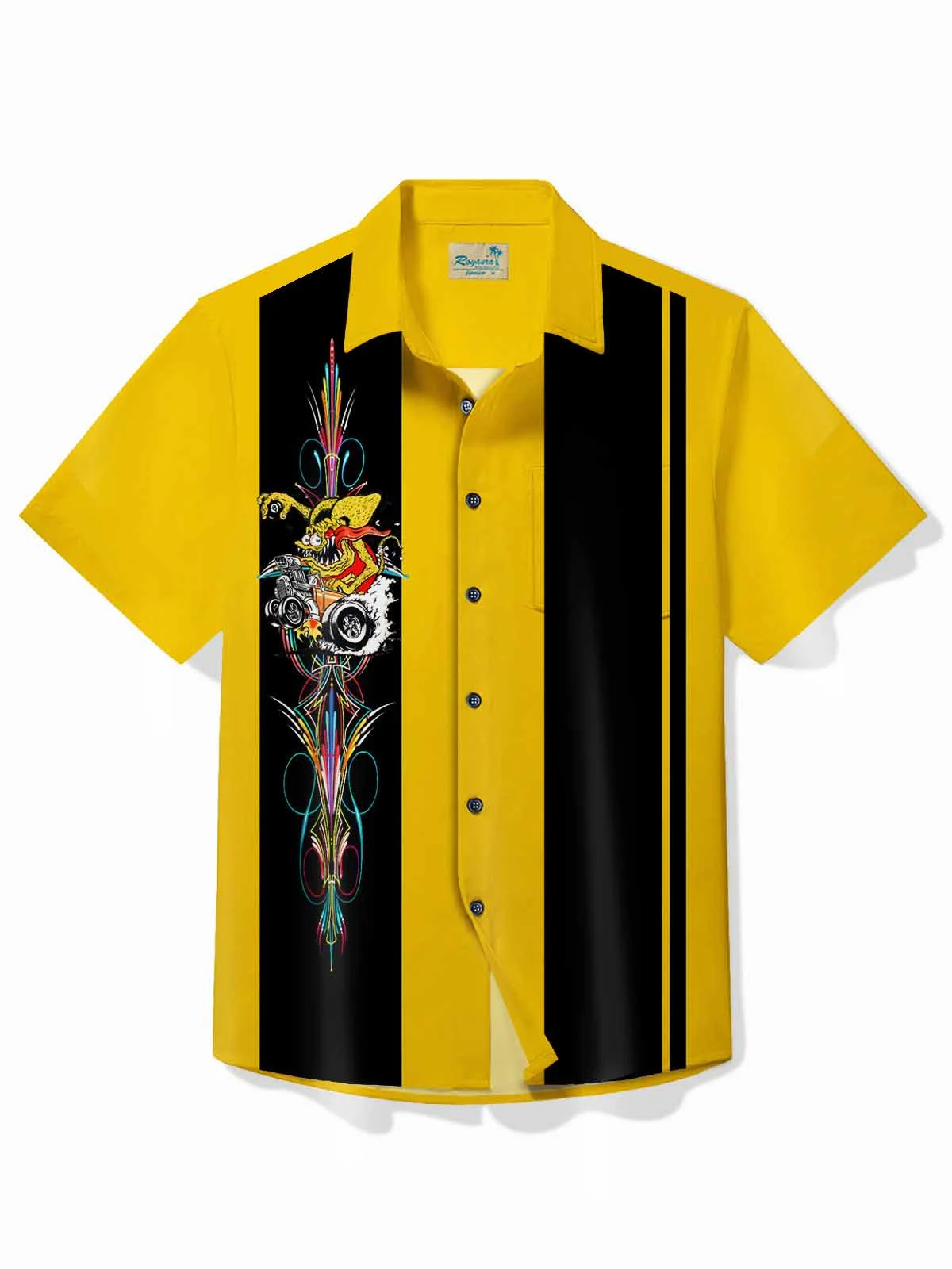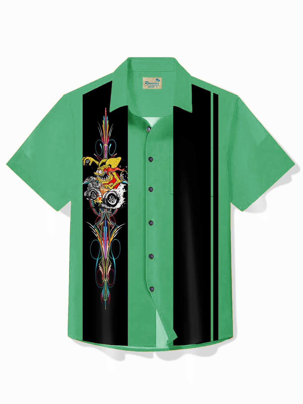 Royaura®  50's Retro Pinstripe Car Men's Bowling Shirt Cartoon Art Stretch Pocket Camp Shirt Big Tall
