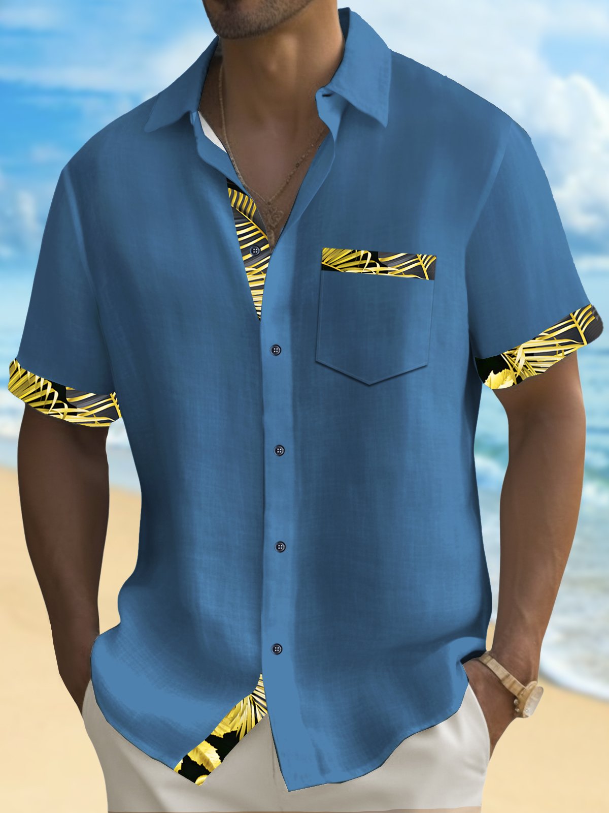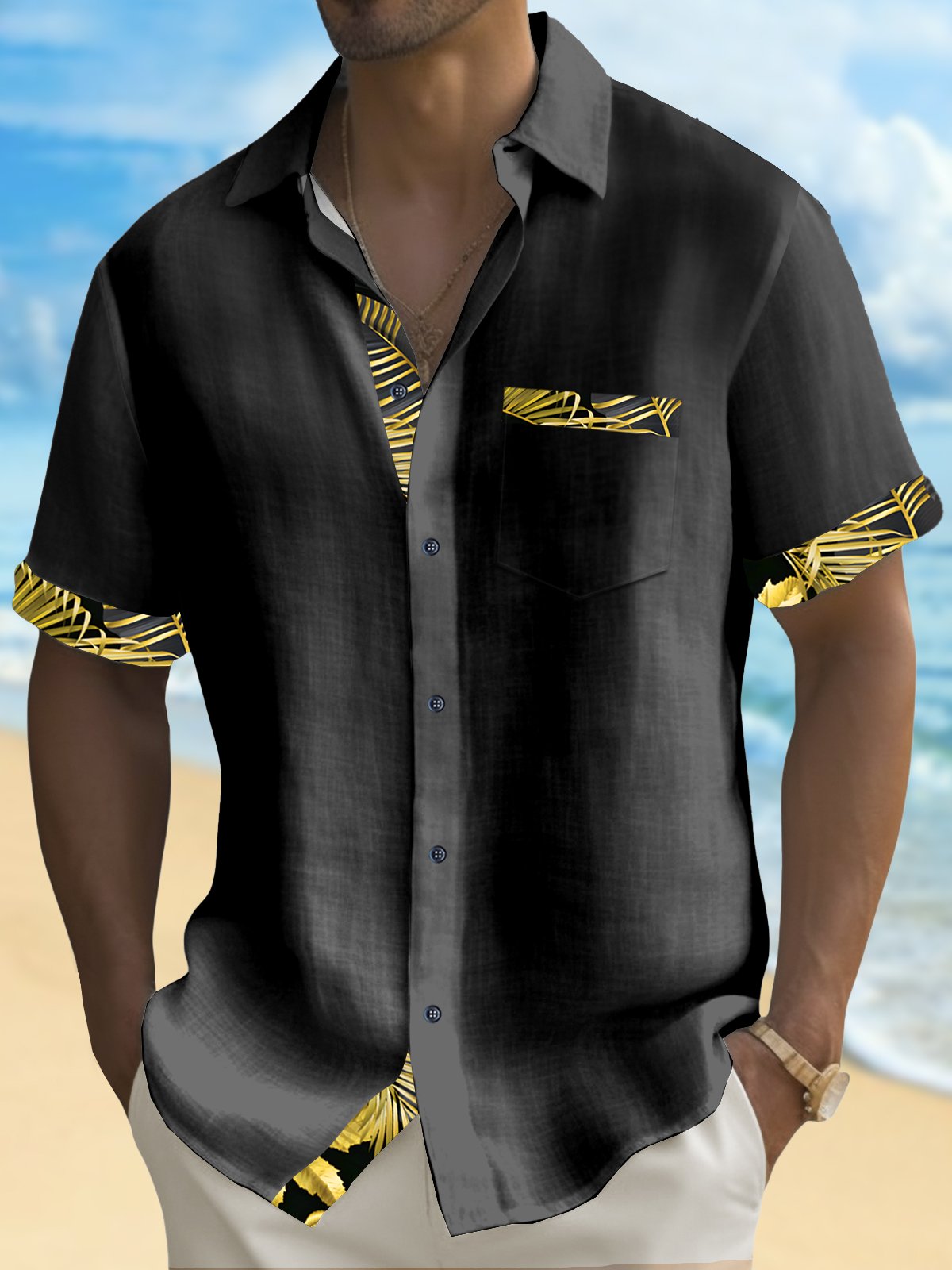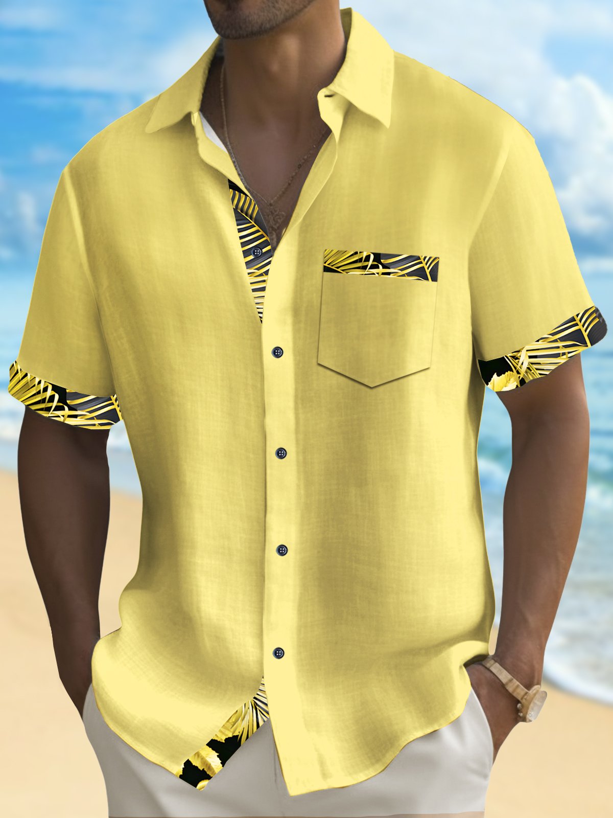 Royaura® Basic Men's Hawaiian Shirt Gold Botanical Print Stretch Pocket Camping Shirt