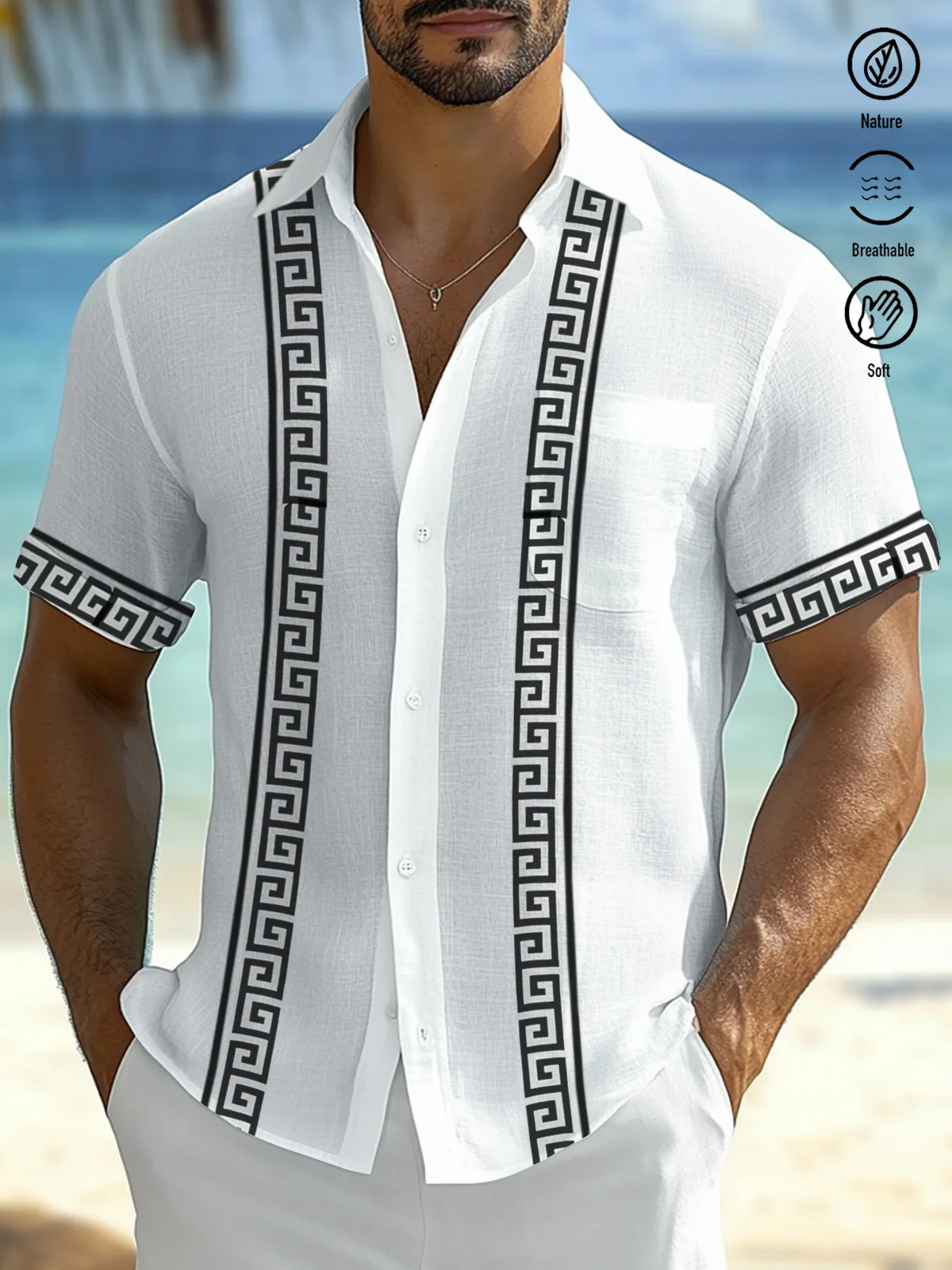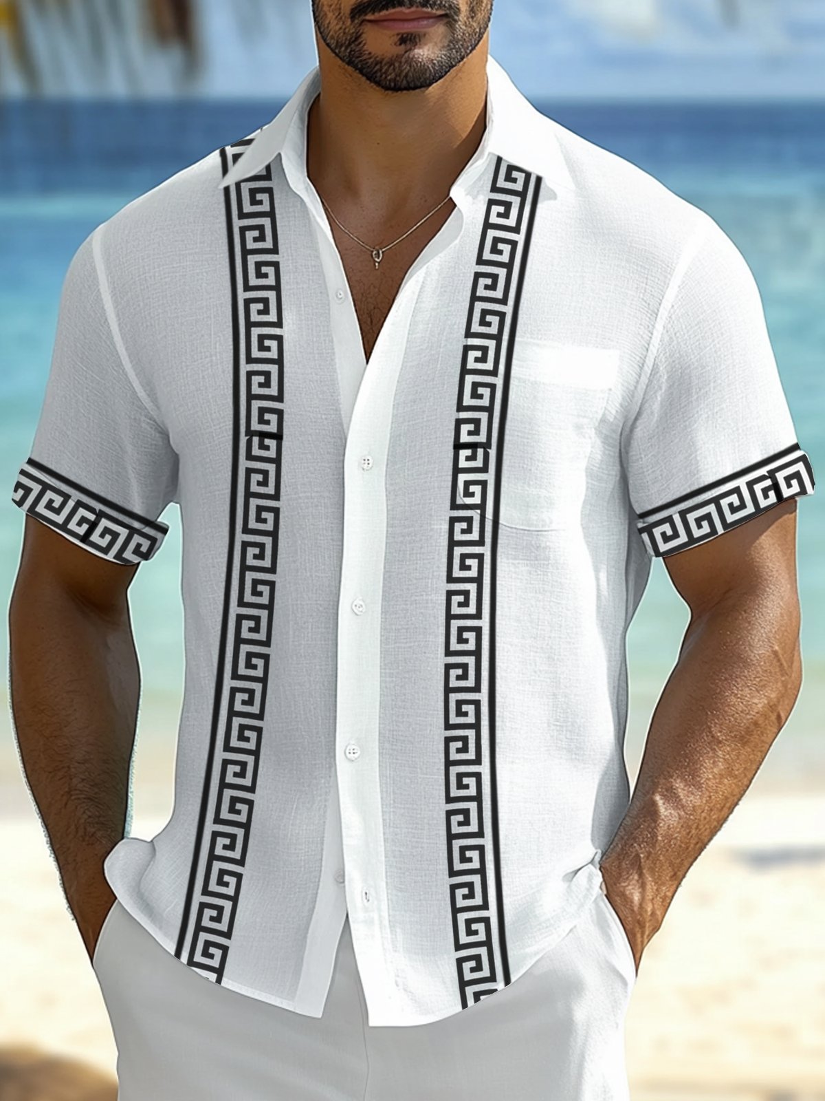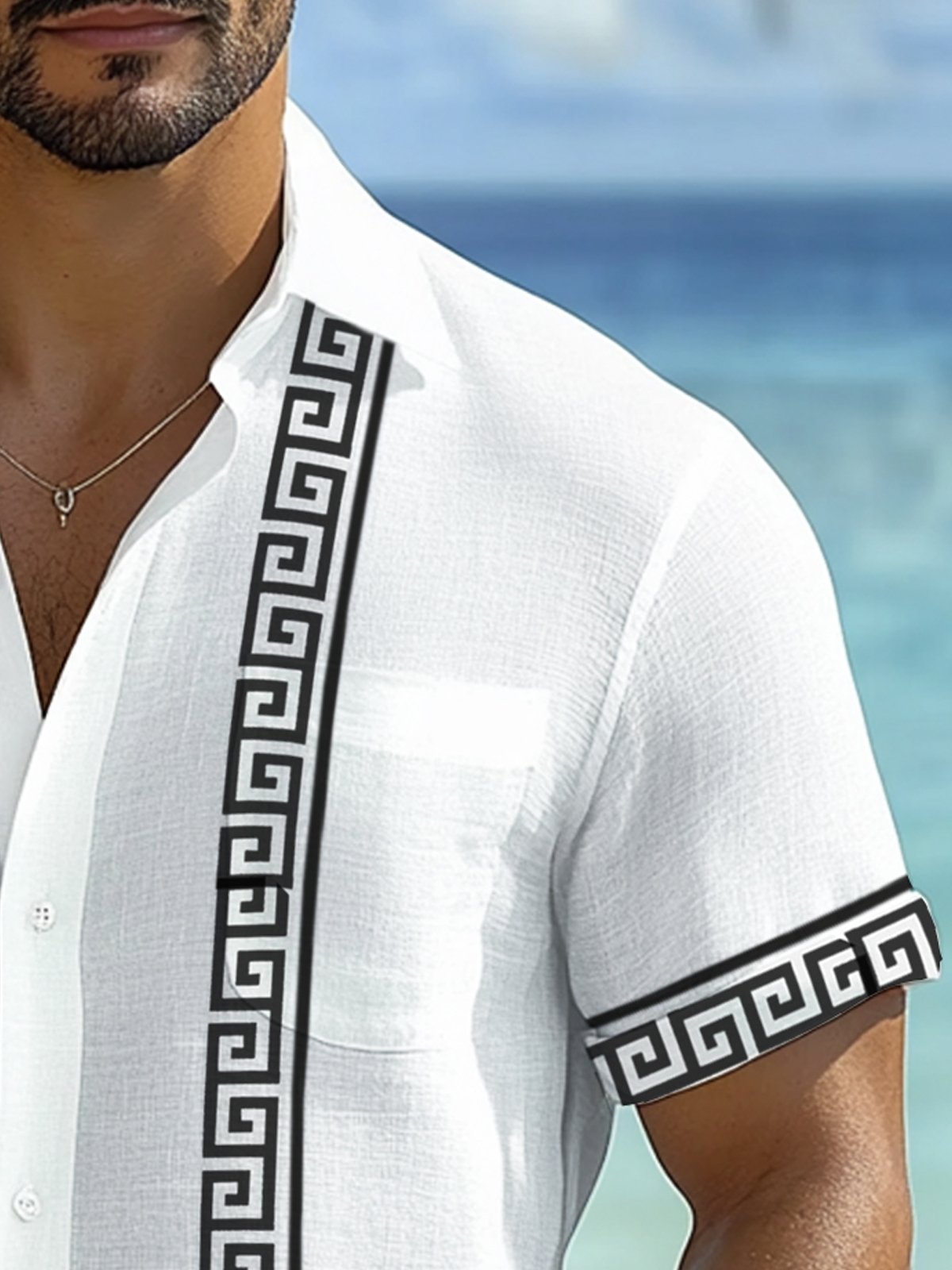 Royaura® Cotton Linen Retro Palace Style Geometric Print Men's Button Pocket Short Sleeve Shirt Big & Tall