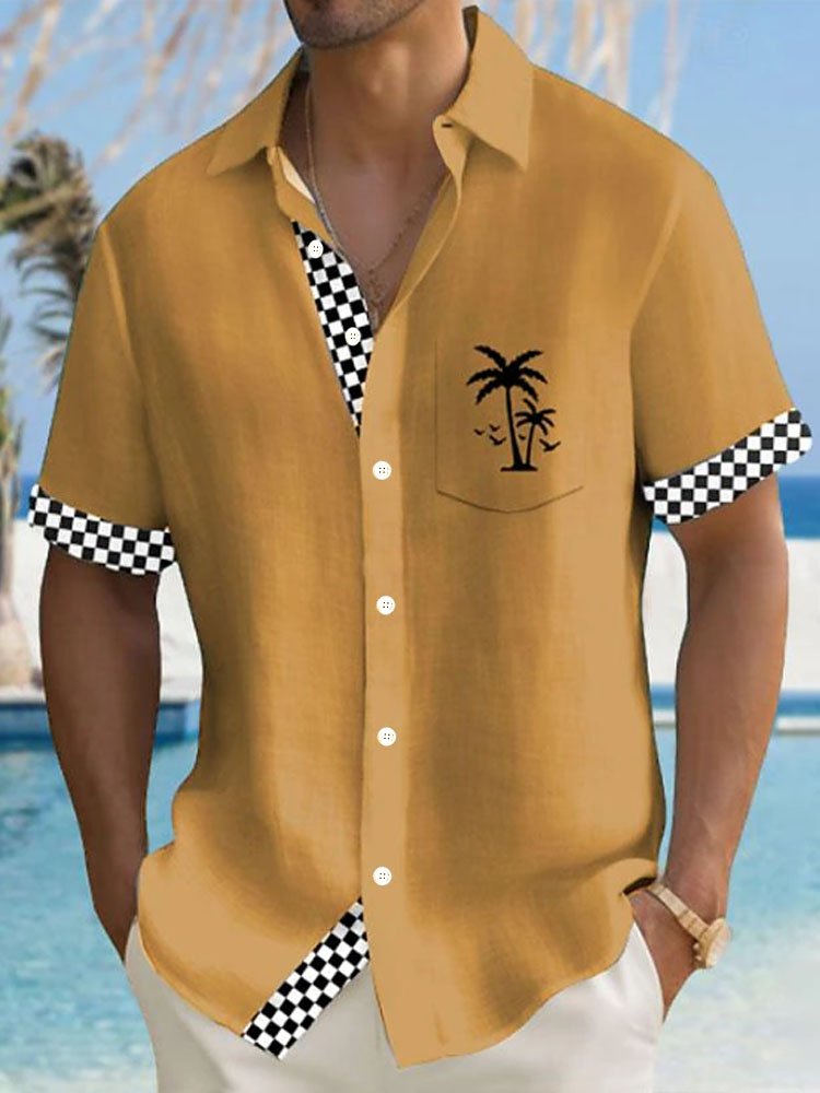 Royaura® Hawaiian Black and White Plaid Coconut Tree 3D Print Men's Button Pocket Short Sleeve Shirt