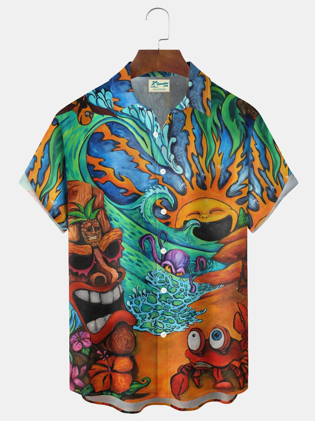 Royaura® Hawaiian Retro Abstract Art Tiki Print Men's Button-Down Short-Sleeve Shirt Big & Tall