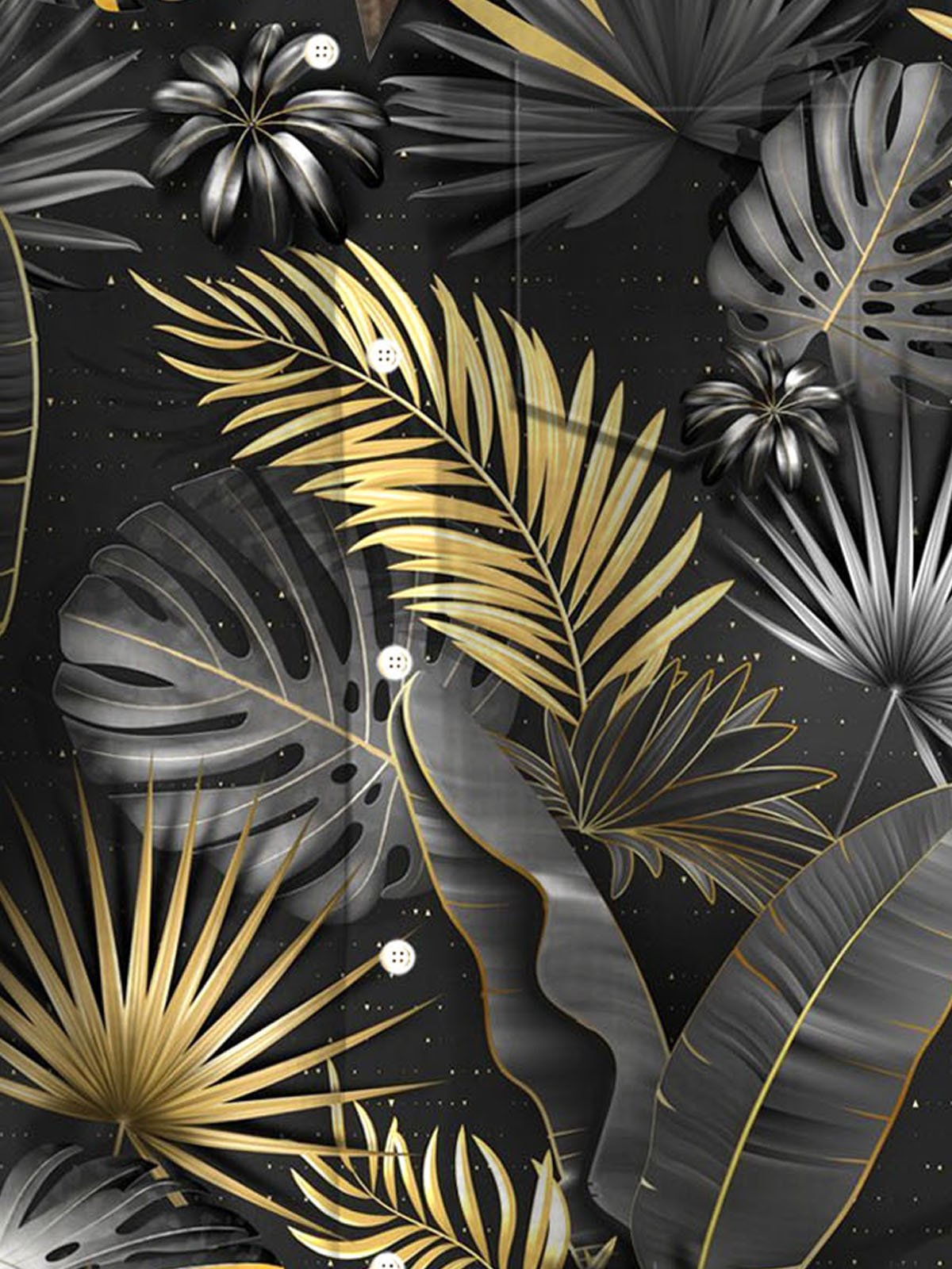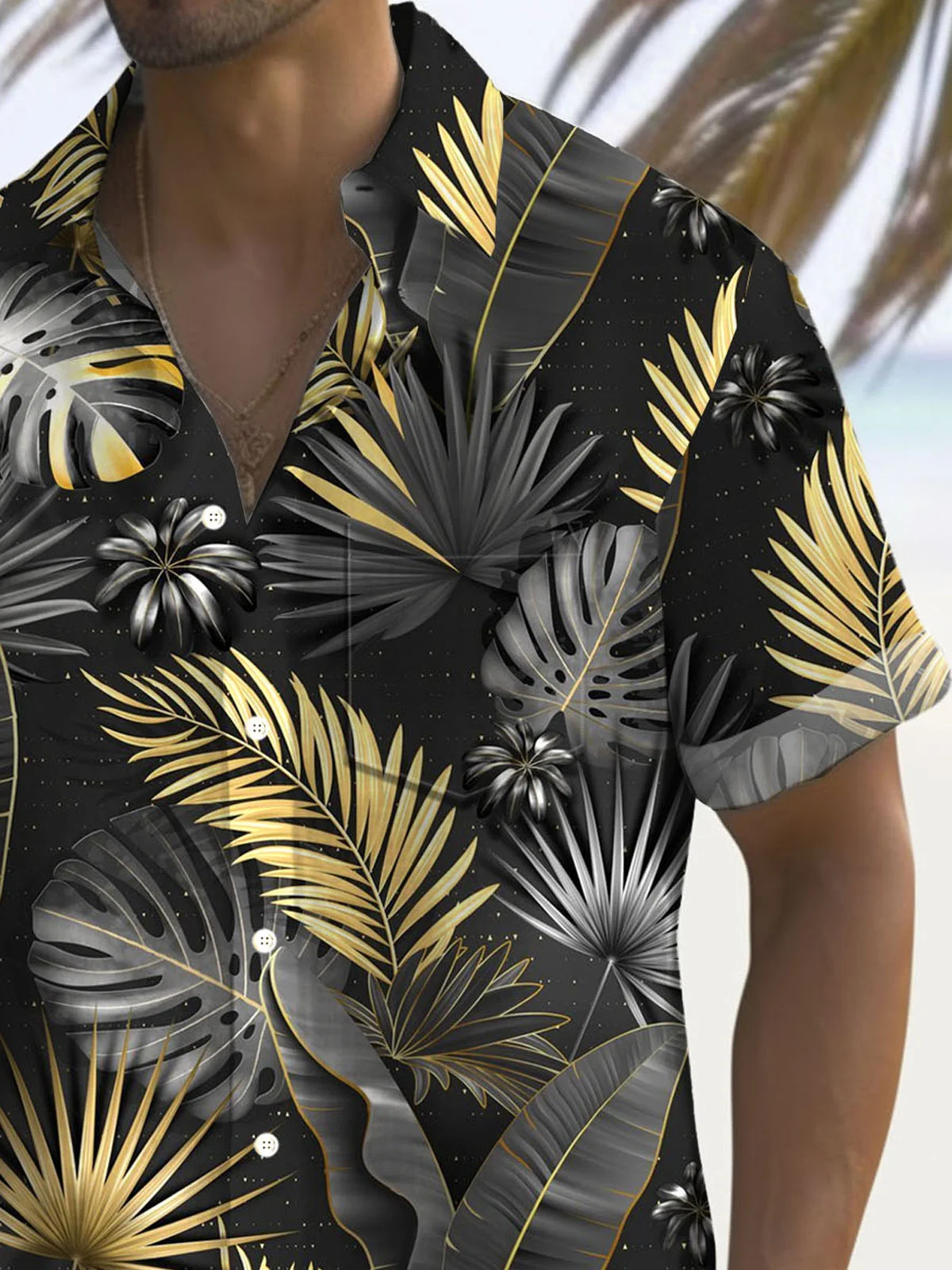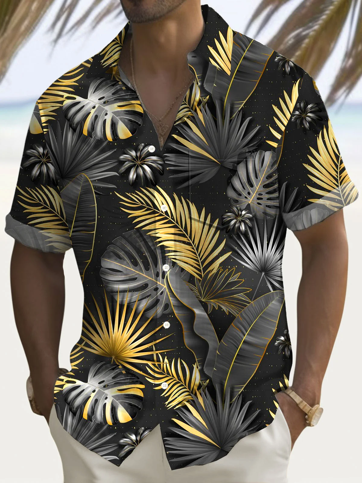 Royaura® Hawaiian Tropical Gold Floral 3D Print Men's Button Pocket Short Sleeve Shirt