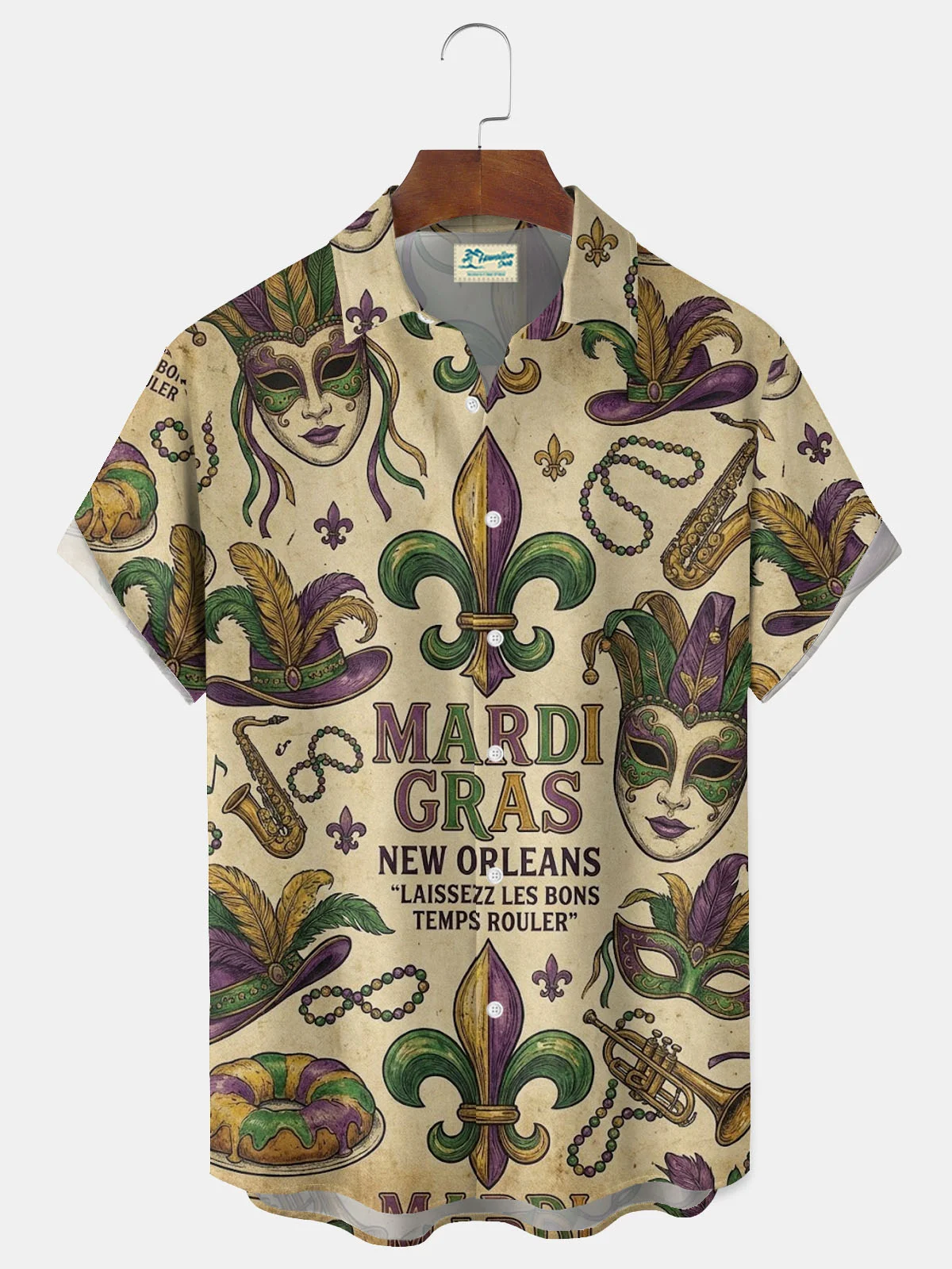Royaura® Mardi Gras Carnival Print Men's Button-Down Pocket Short-Sleeve Holiday Shirt Big & Tall