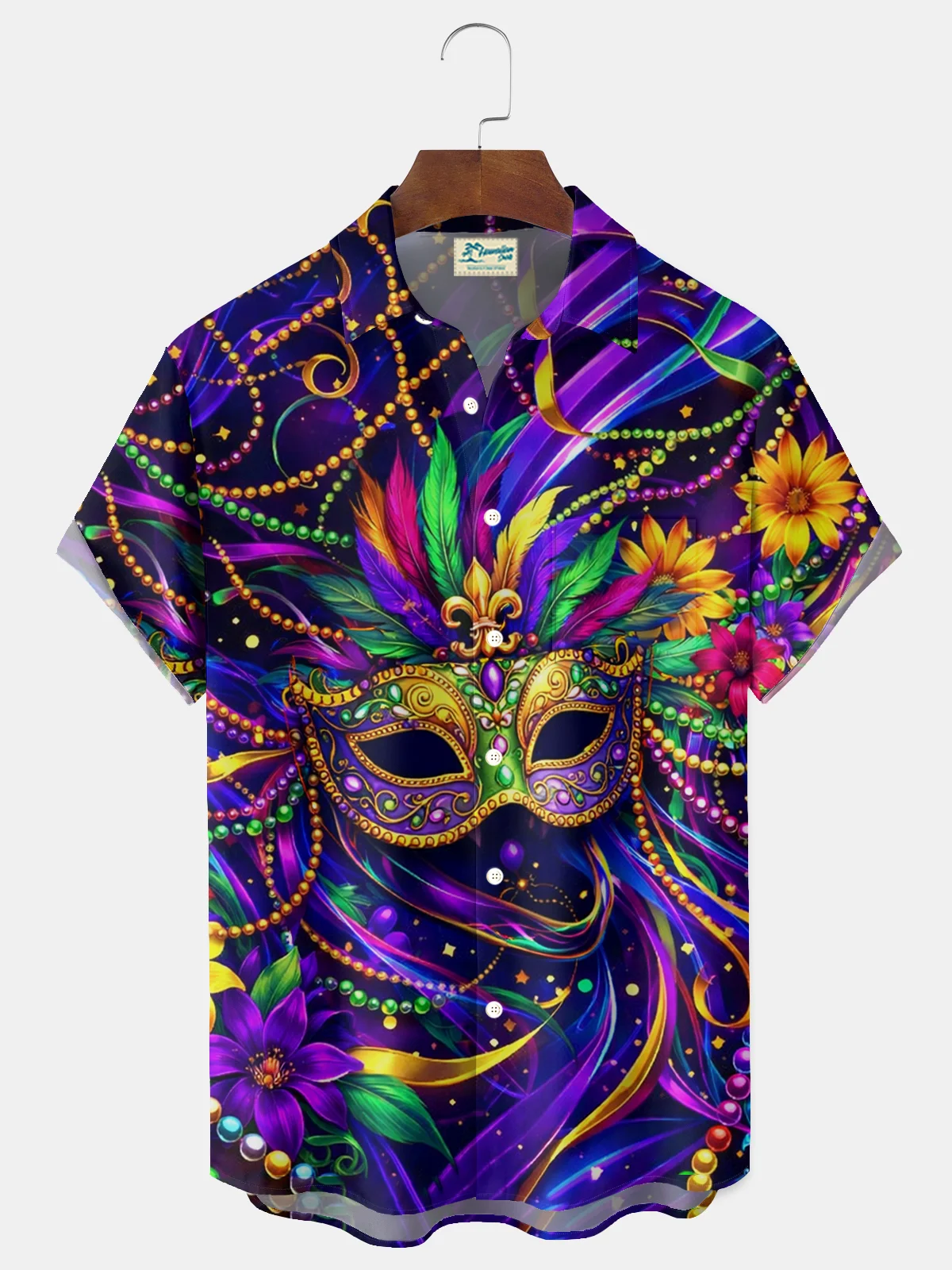 Royaura® Mardi Gras Mask Print Men's Button-Down Short-Sleeved Shirt Big & Tall
