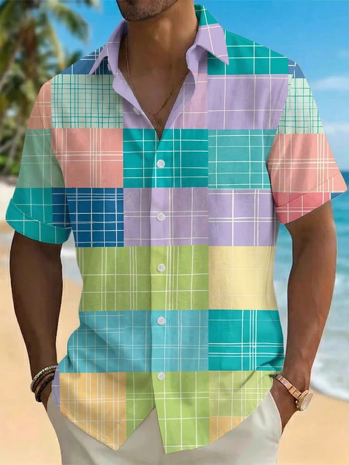 Royaura® Men's Basic Macaron Palette Summer Vibrant Minimalist Plaid Print Retro Button Down Short-Sleeve Big & Tall