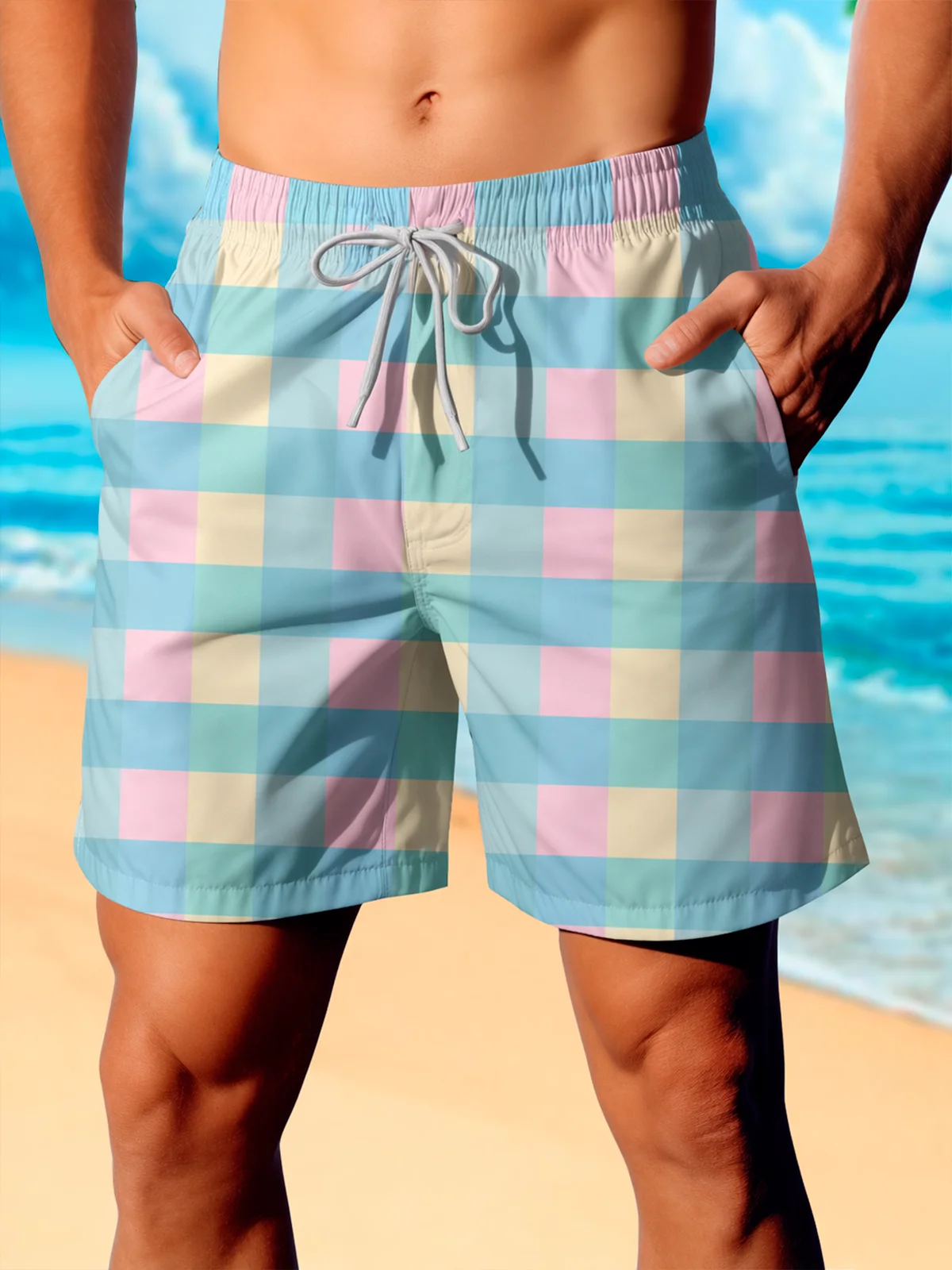 Royaura® Men's Basic Pastel Plaid Check Print Retro Print Beach Shorts
