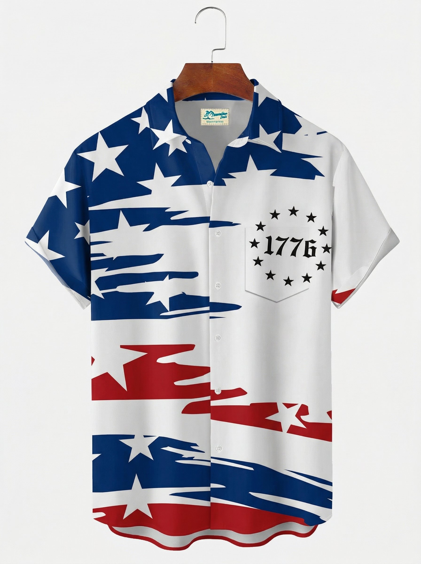 Royaura® Men's Holiday 1776 Betsy Ross Stars Distressed American Flag Patriotic Independence Day Button-Down Pocket Short-Sleeve Shirt Big & Tall