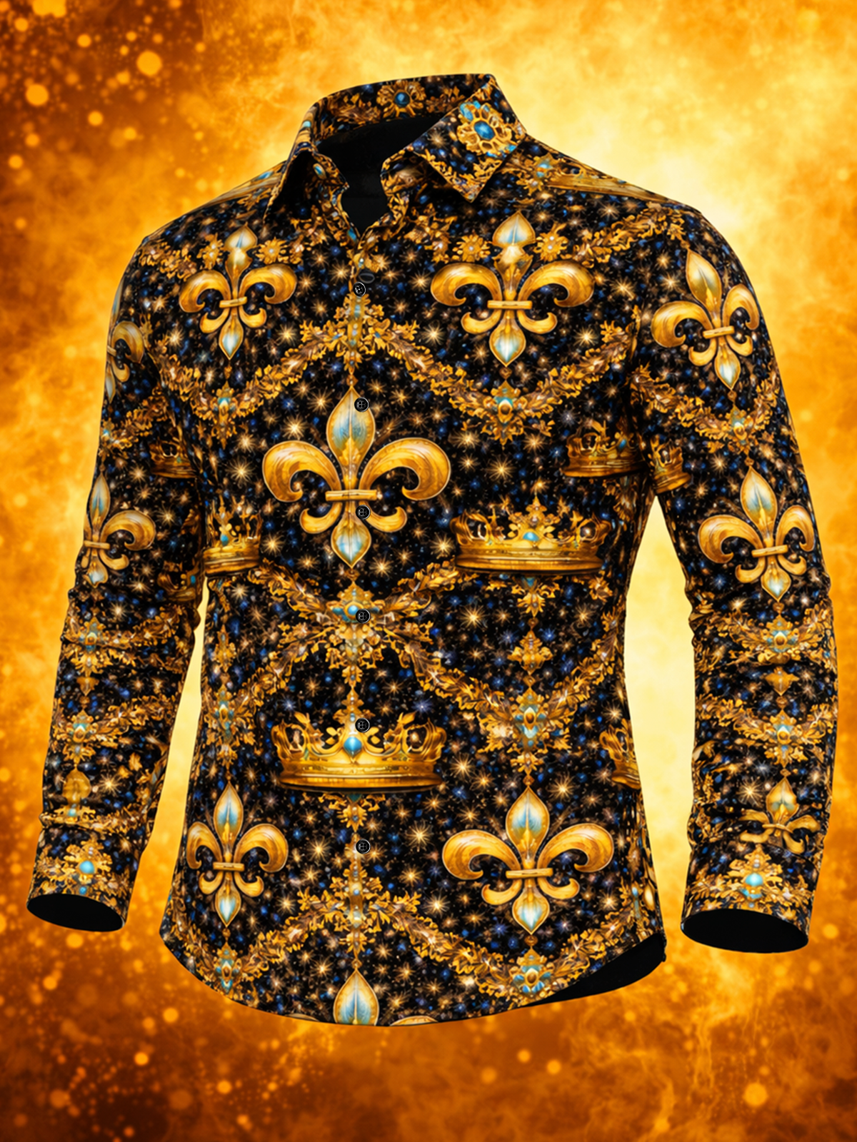 Royaura® Men's Holiday Carnival Mardi Gras Geometric Art Lily Crown Button-Down Print Retro Long-Sleeve Shirt Big & Tall