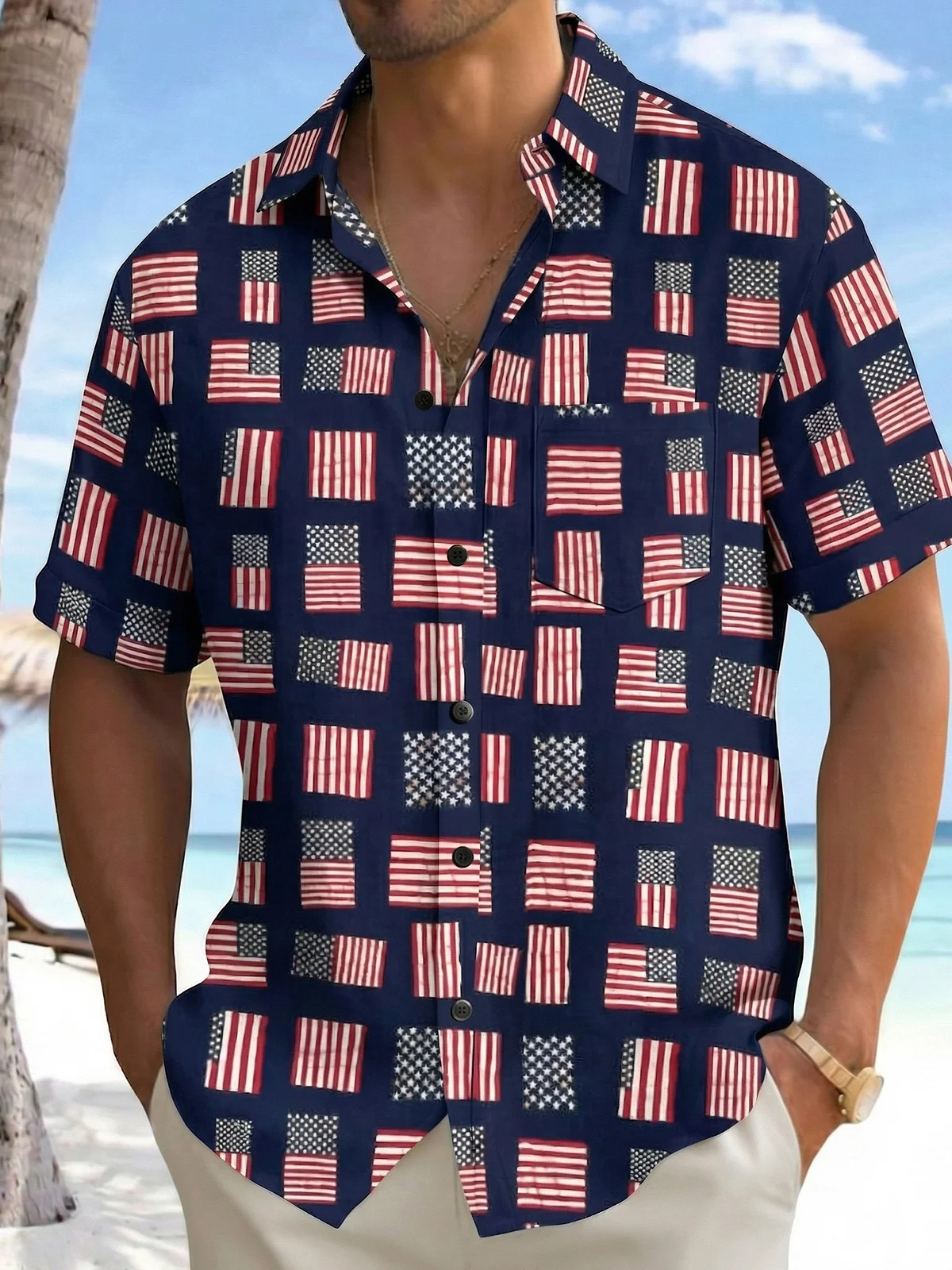 Royaura® Men's Holiday Modern Geometric American Flag Block Pattern Patriotic Party Button-Down Pocket Short-Sleeve Shirt Big & Tall