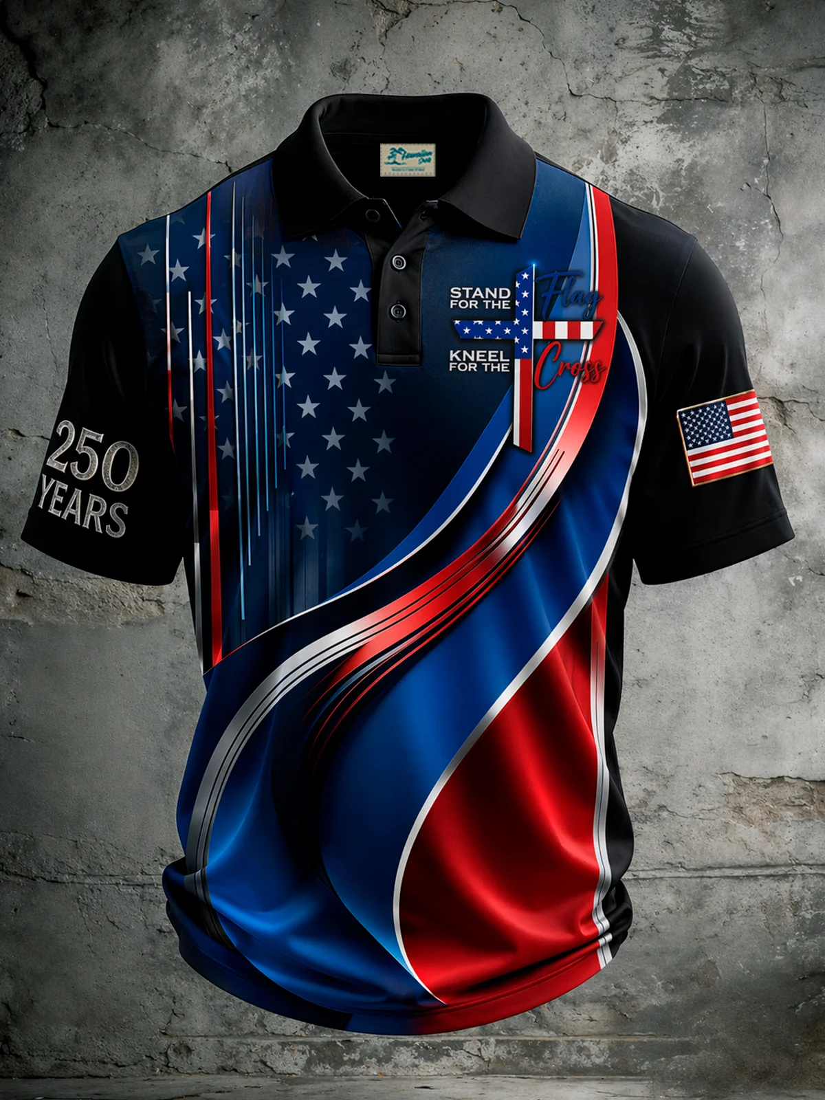 Royaura® Men's Holiday Patriotic Faith American Cross 250 Years Print Retro Button Down Short-Sleesleeved Polo Shirt Big & Tall