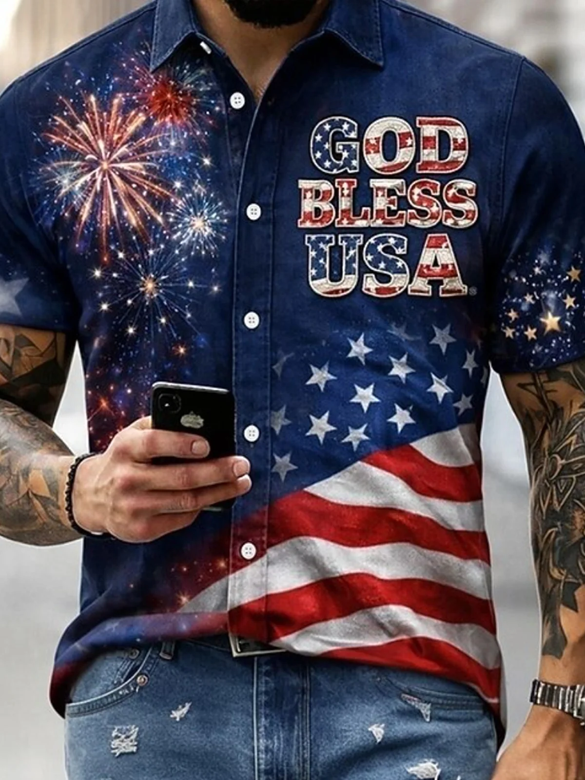 Royaura® Men's Holiday Patriotic God Bless USA Flag Fireworks Graphic Modern 4th of July Button-Down Pocket Short-Sleeve Shirt Big & Tall