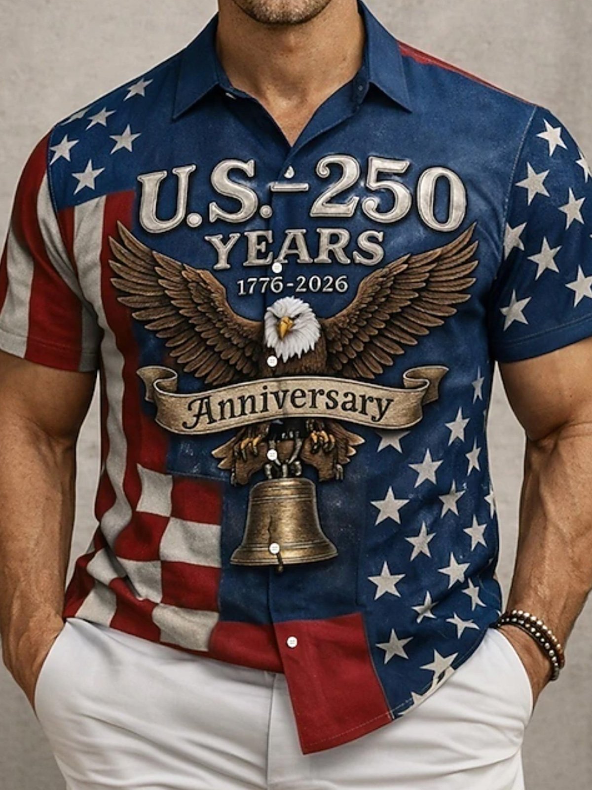 Royaura® Men's Holiday US 250 Years Sestercentennial 1776-2026 Eagle Liberty Bell Anniversary Button-Down Pocket Short-Sleeve Shirt Big & Tall