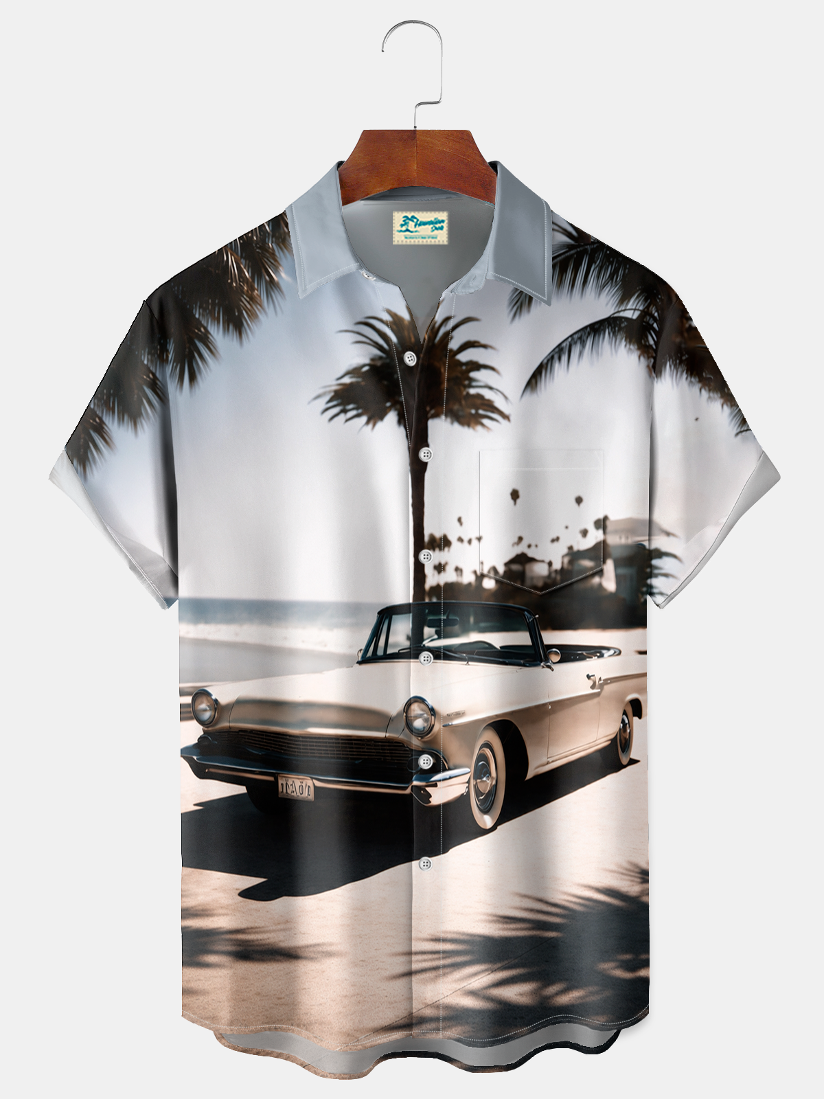 Royaura® Men's Tropic 50s Retro Palm Sunny Beach Car Print Button Down Short-Sleeve Big & Tall