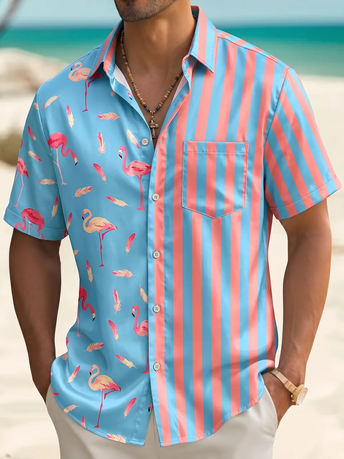 Royaura® Men's Tropic  Asymmetrical Splicing Design Playful Flamingo Motif Vibrant Holiday Vibe Print Retro Button Down Short-Sleeve Big & Tall