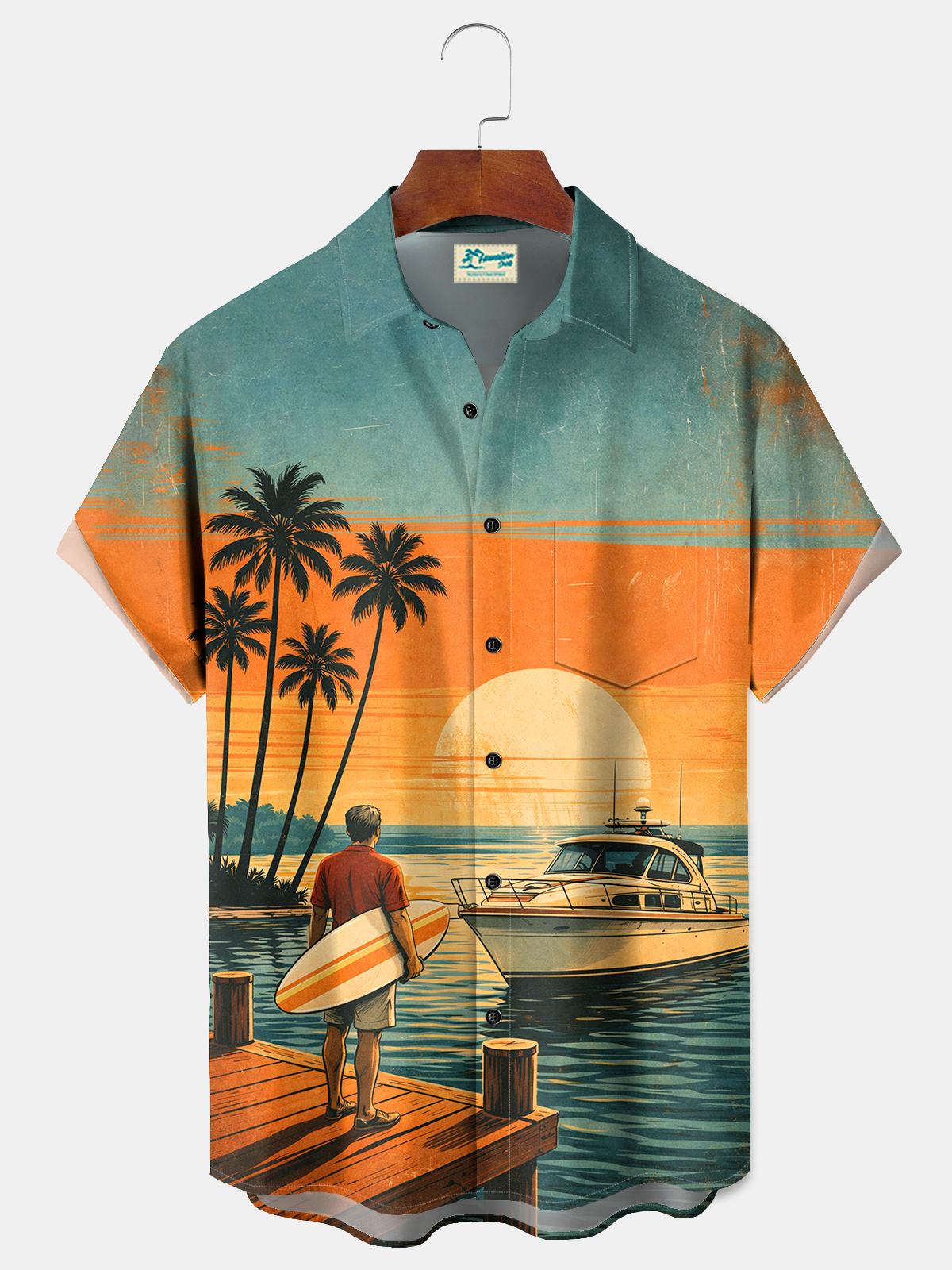 Royaura® Men's Tropic Cruise Surfer Pier Sunset Yacht Palm Tree Tropical Ocean Retro Print Button Down Short-Sleeve Big & Tall
