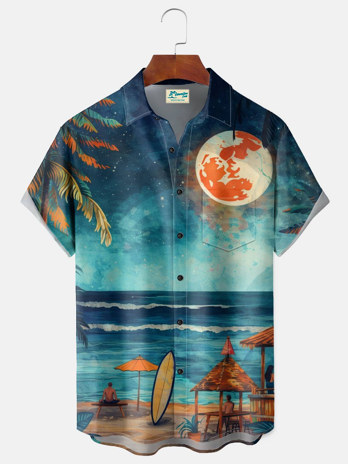 Royaura® Men's Tropic Night Tropical Beach Full Moon Print Button Down Short-Sleeve Big & Tall