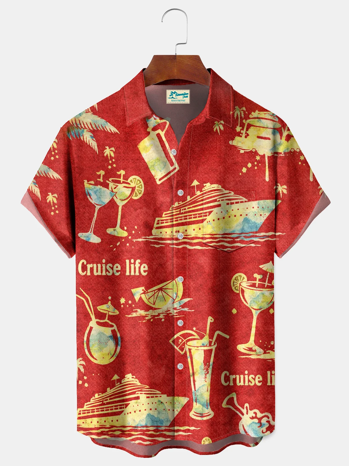 Royaura® Men's Tropic Red Watercolor Grand Cruise Ship & Tropical Cocktail Print Button Down Short-Sleeve Big & Tall