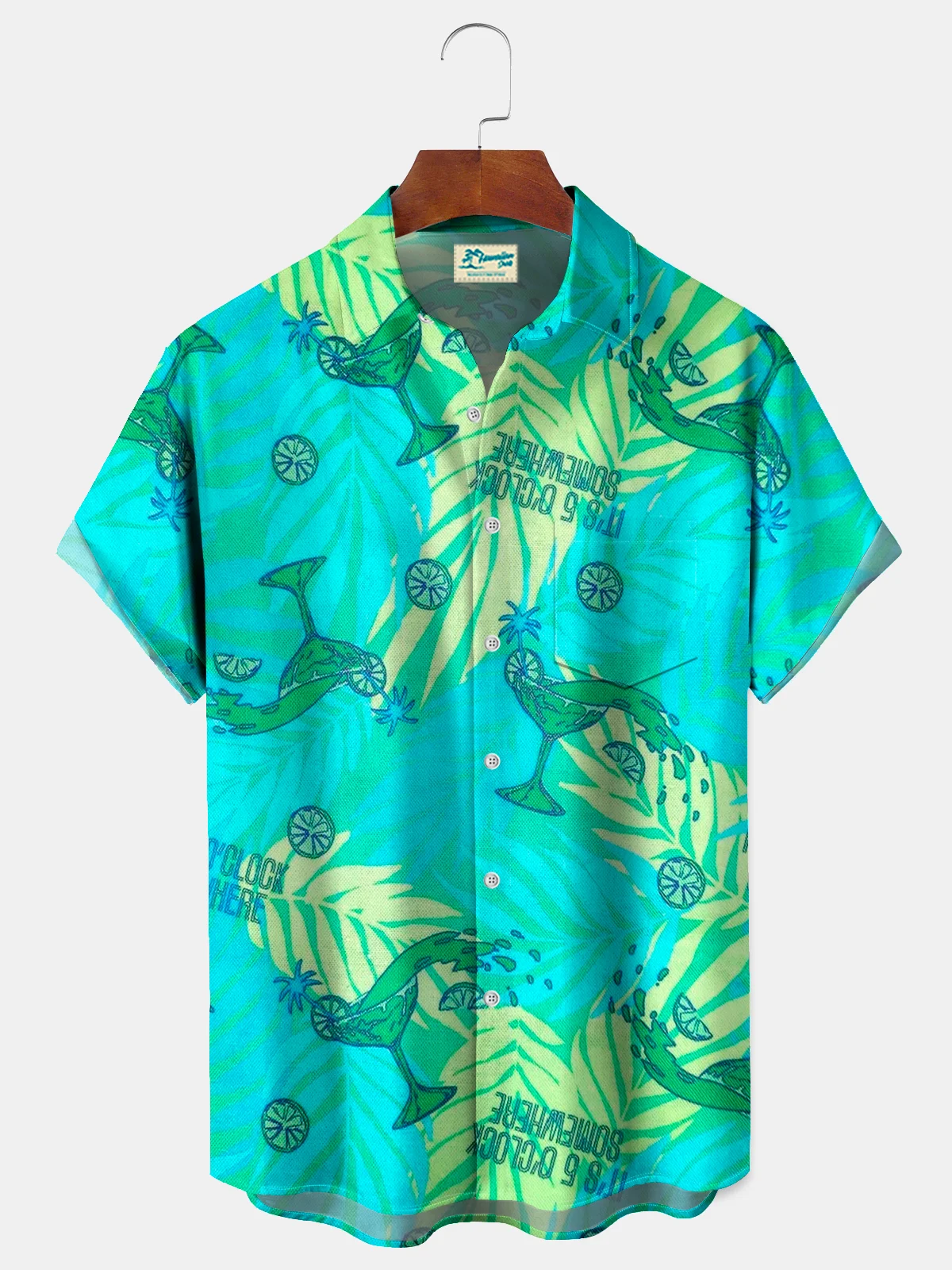 Royaura® Men's Tropic Teal & Lime Green Tropical Palm Leaf & 'It's 5 O'Clock Somewhere' Cocktail Print Button Down Short-Sleeve Big & Tall