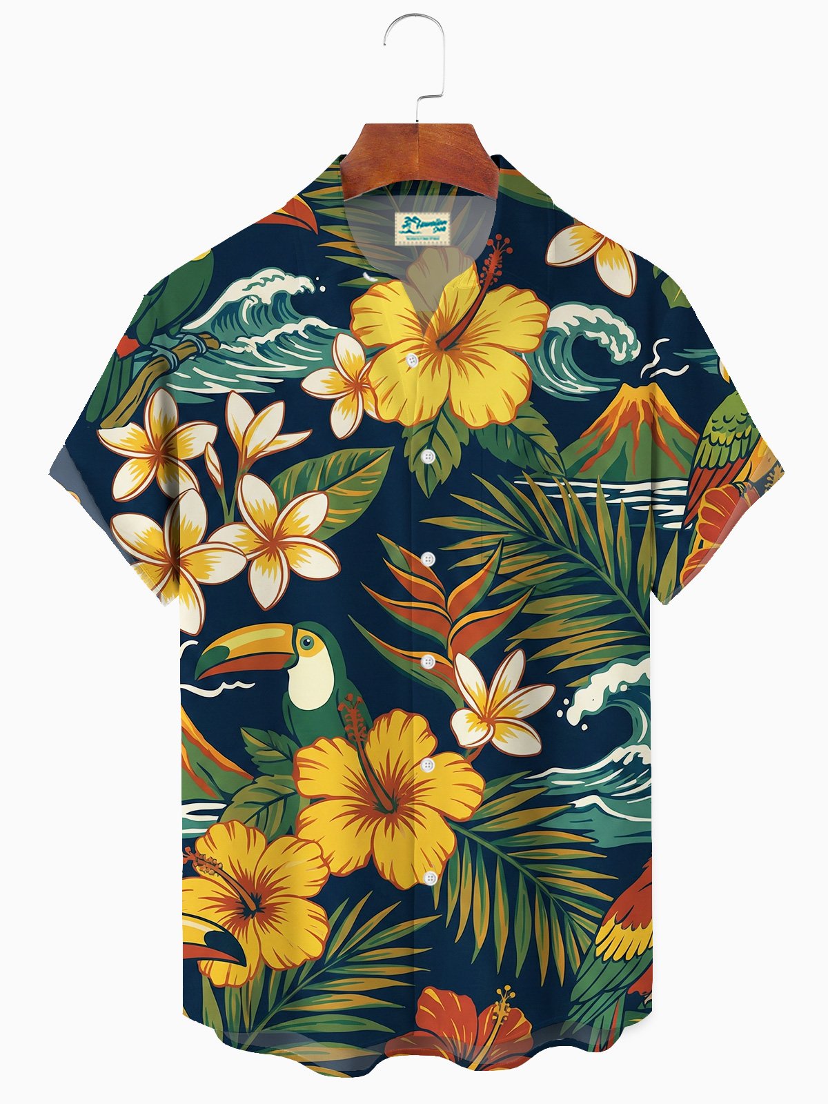 Royaura® Men's Tropical Hibiscus Floral Graphic Retro Hawaiian Aloha Toucan Bird Print Button-Down Short-Sleeve Shirt Big & Tall