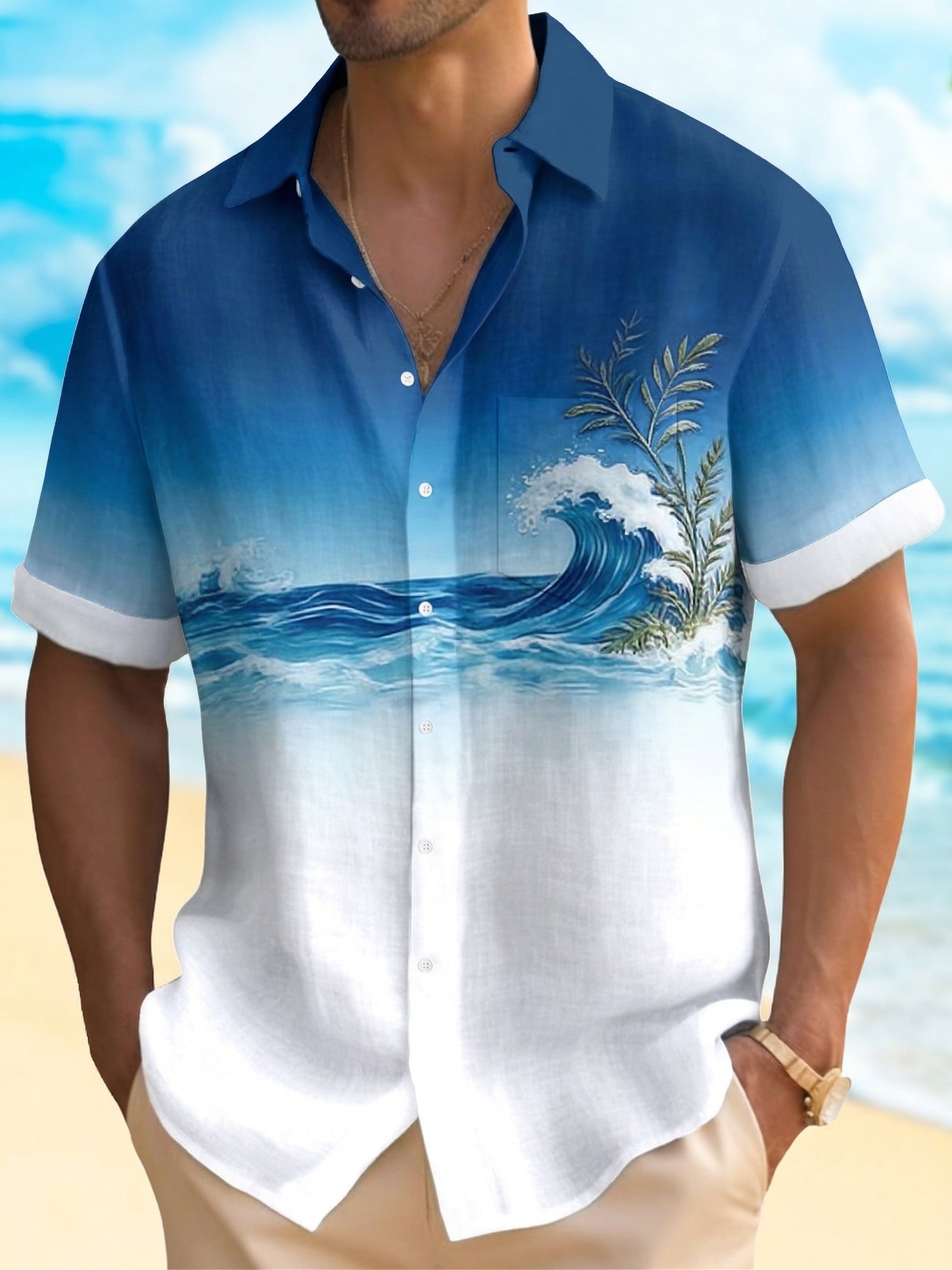 Royaura® Men's Vintage Ocean Wave Ombre Beach Graphic Print Button-Down Pocket Short-Sleeve Shirt Big & Tall