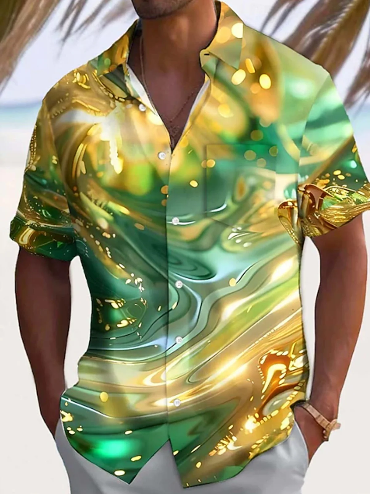 Royaura® Men's Vintage Psychedelic Green Gold Fluid Abstract Glow Pattern Graphic Shirt Big & Tall