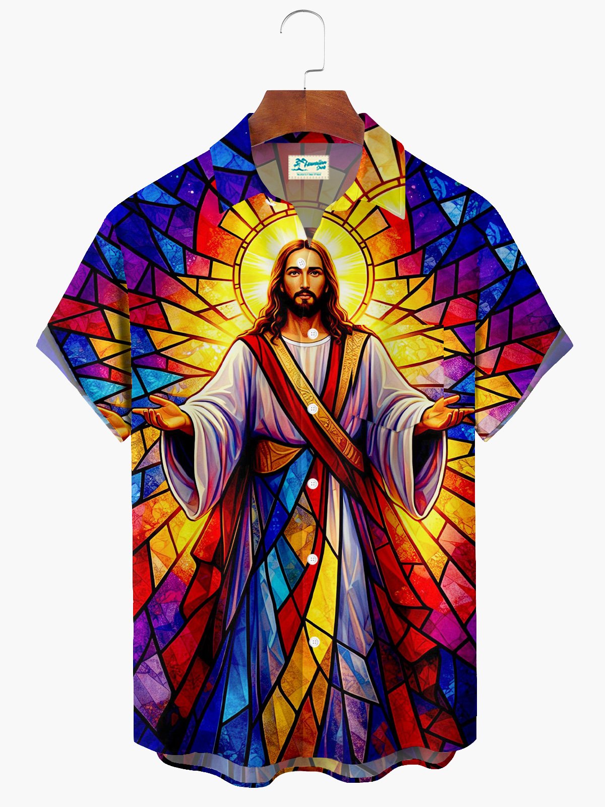 Royaura® Men's Vintage Stained Glass Jesus Christ Christian Religious Art Graphic Button-Down Pocket Short-Sleeve Shirt Big & Tall