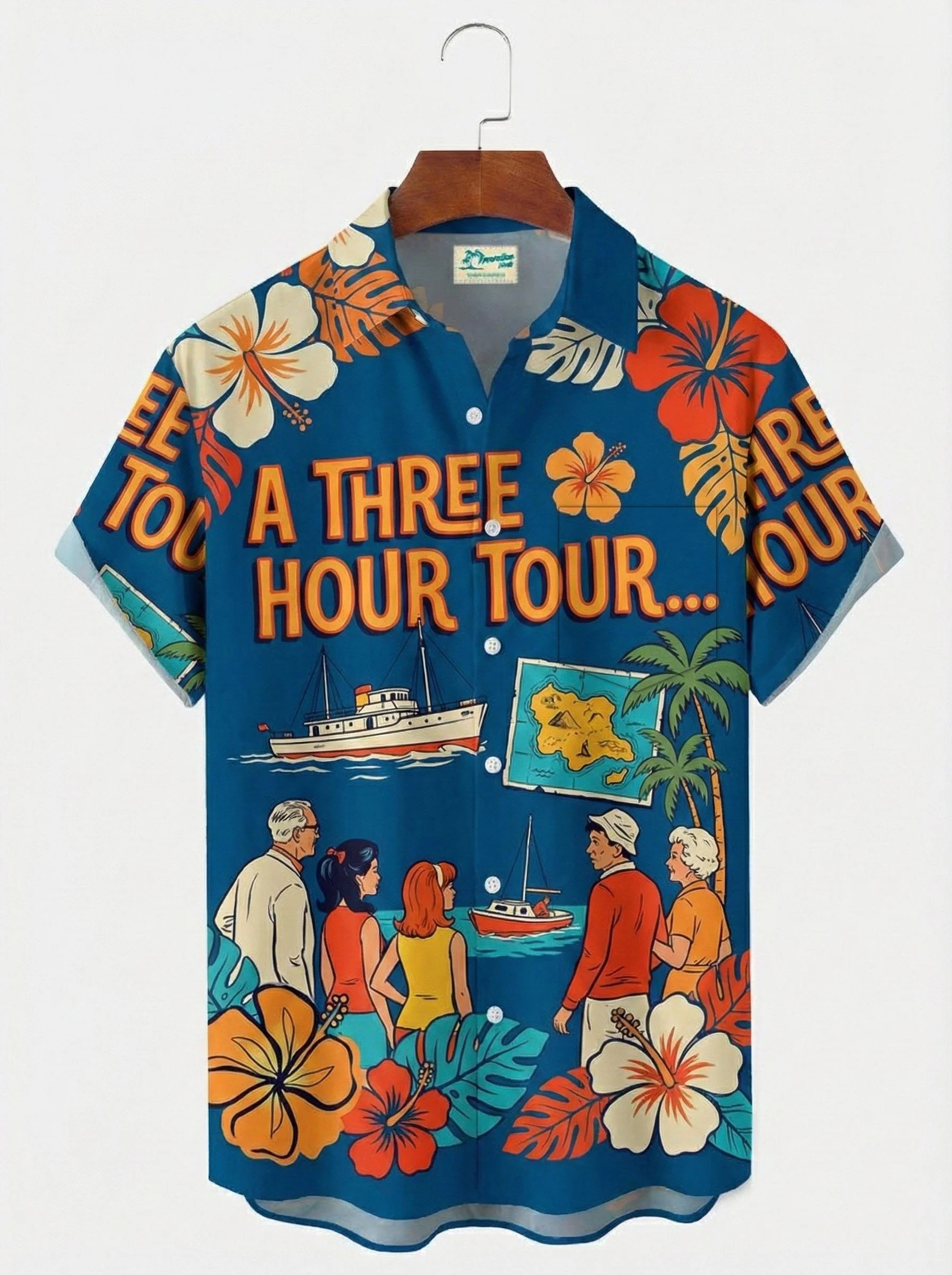 Royaura® Retro Film-Inspired Floral Print Men's Short-Sleeved Button-Up Resort Shirt Three Hour Tour Classic Aloha Button-Up Shirt Big & Tall