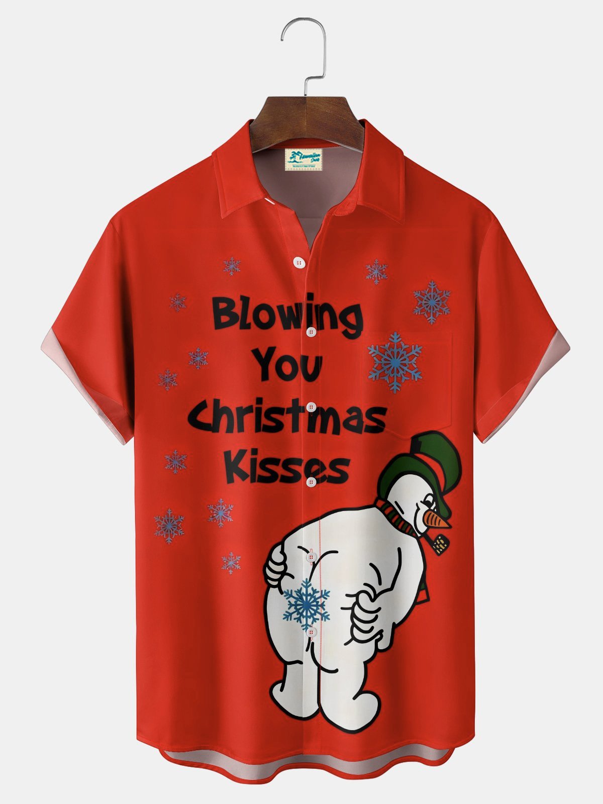 Royaura® Retro Holiday Christmas White Snowman Print Men's Button Pocket Short Sleeve Shirt Big & Tall