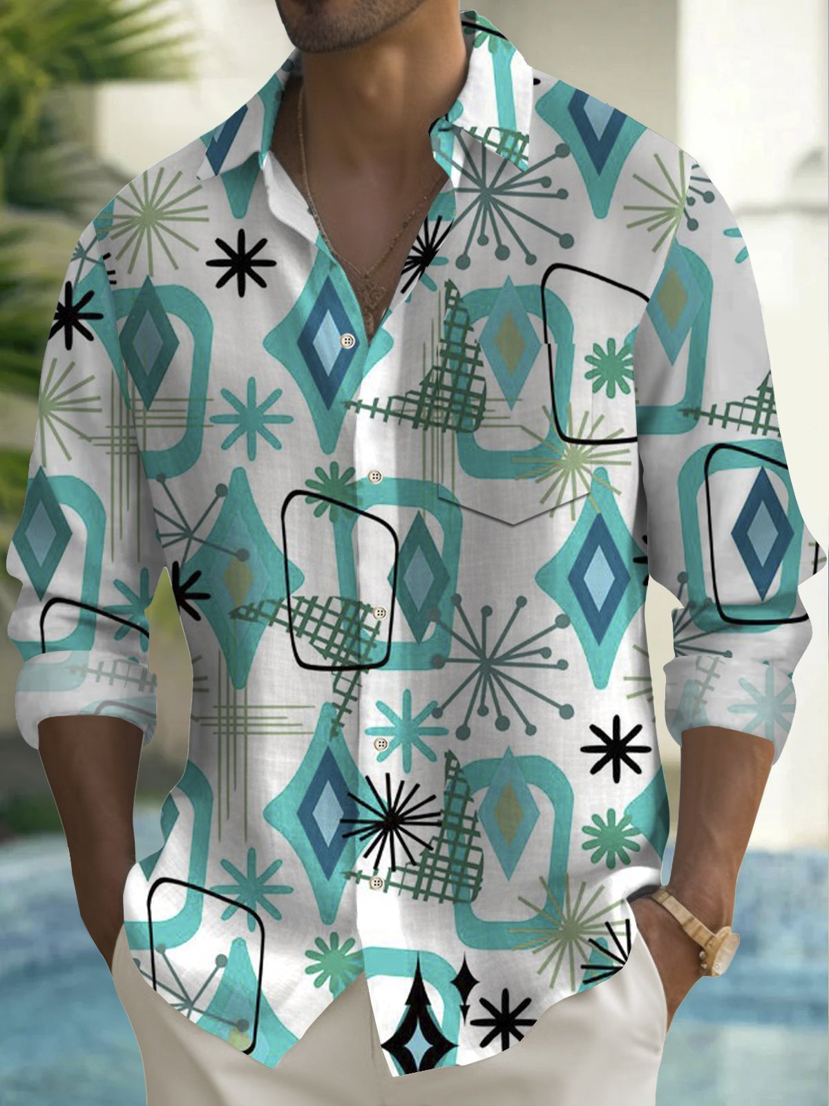 Royaura® Retro Medieval Geometric Print Men's Lapel Pocket Long Sleeve Shirt Big & Tall
