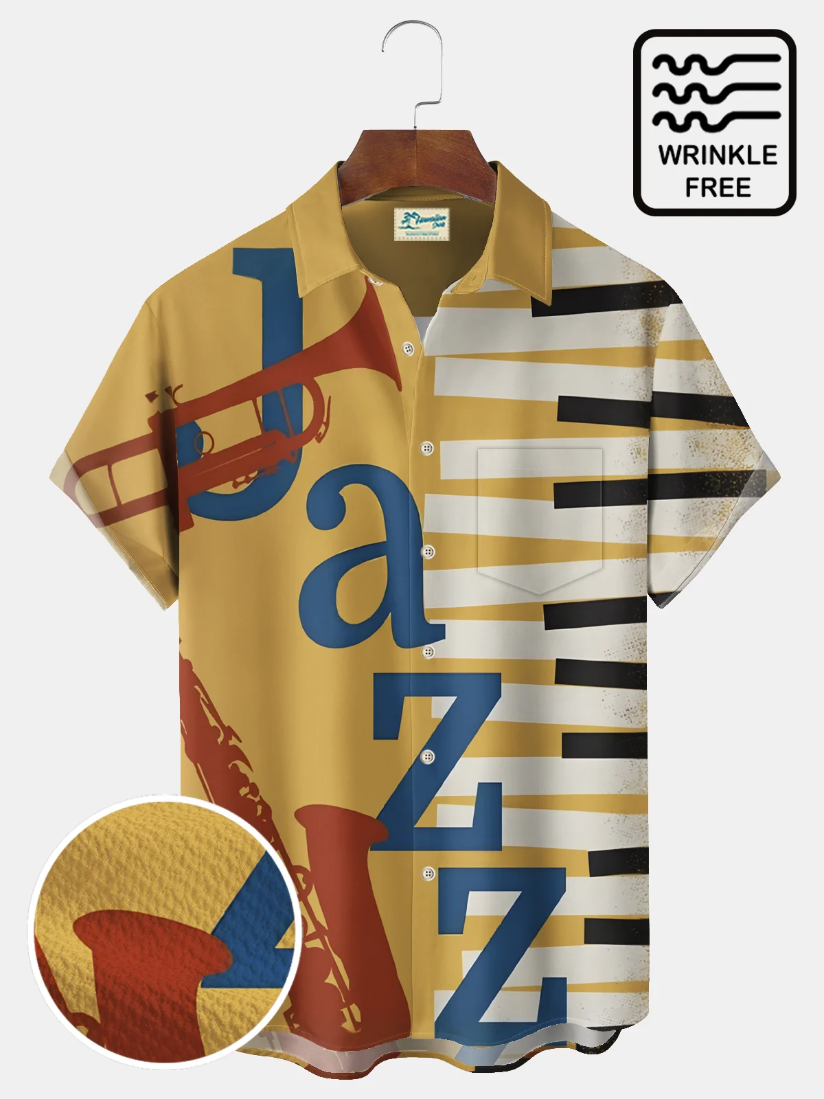 Royaura® Vintage Jazz Music Print Men's Casual Stylish Wrinkle Free Seersucker Hawaiian Summer Shirts Short Sleeve Shirt Big Tall