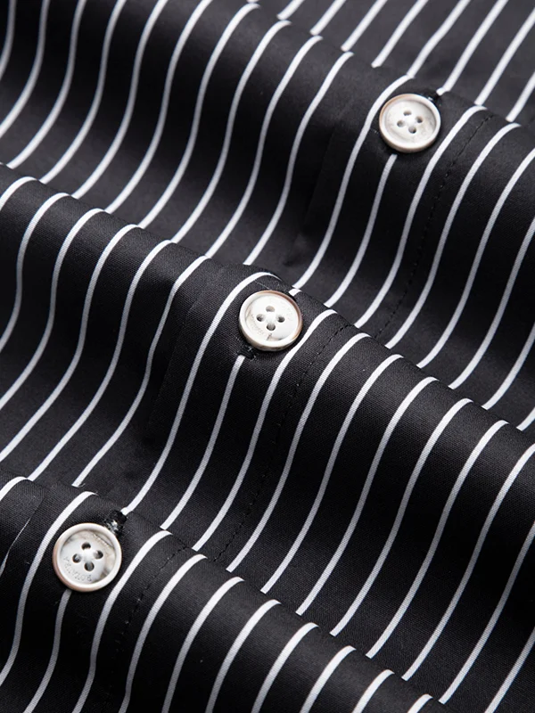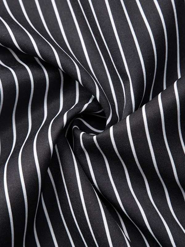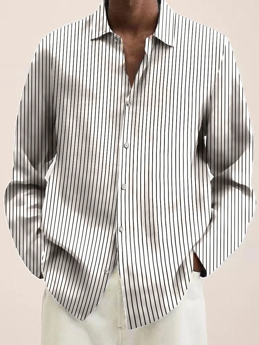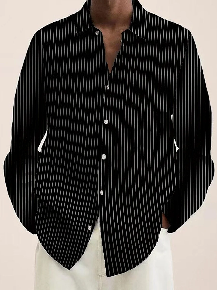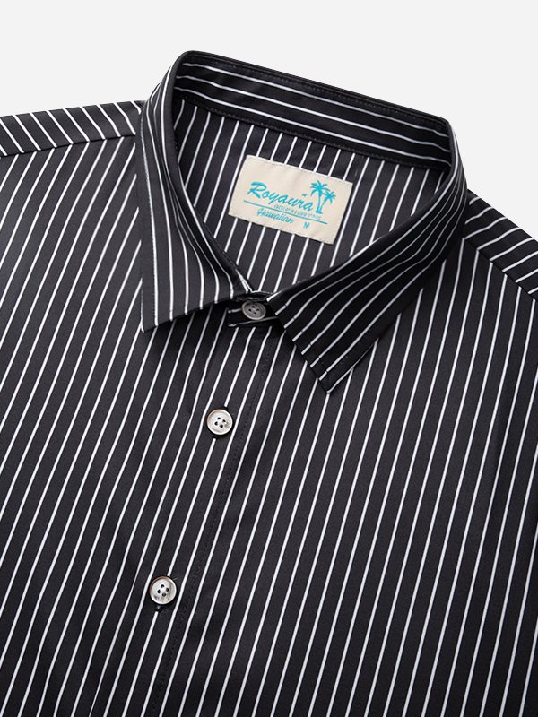 Royaura Basic Black and White Striped Men's Casual Long Sleeve Shirts Stretch Plus Size Aloha Camp Pocket Shirts