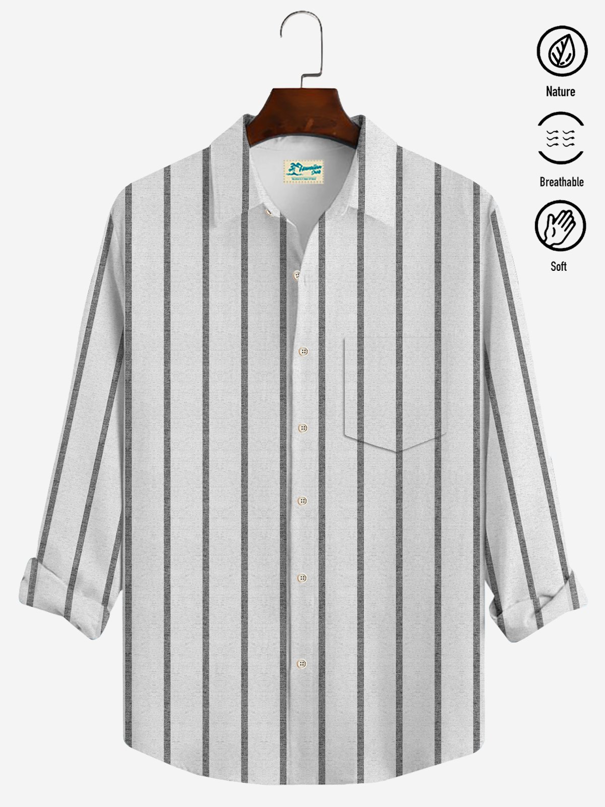 Royaura® Cotton Linen Basic Natural Fiber Striped Print Men's Button Down Pocket Long Sleeve Shirt