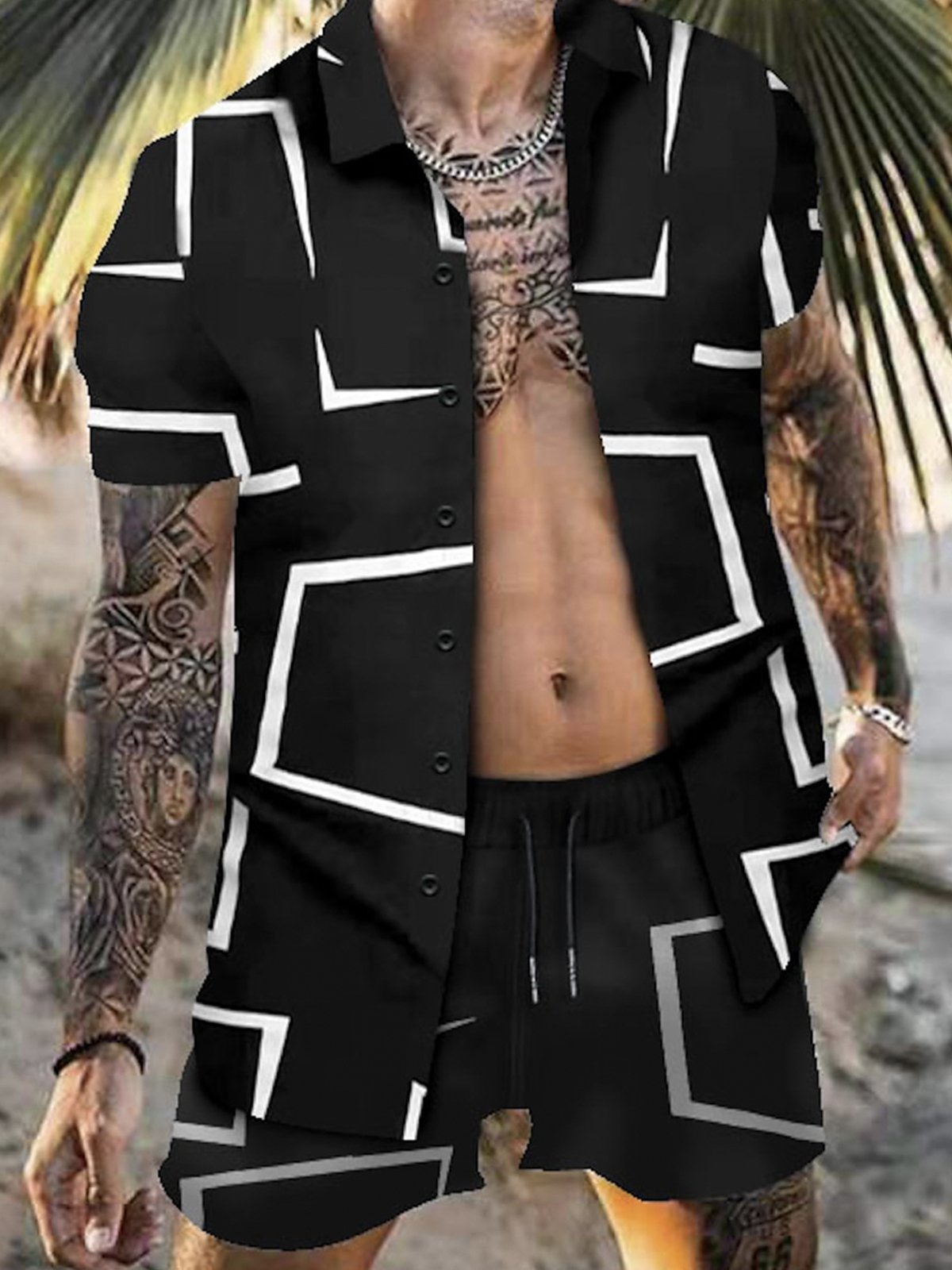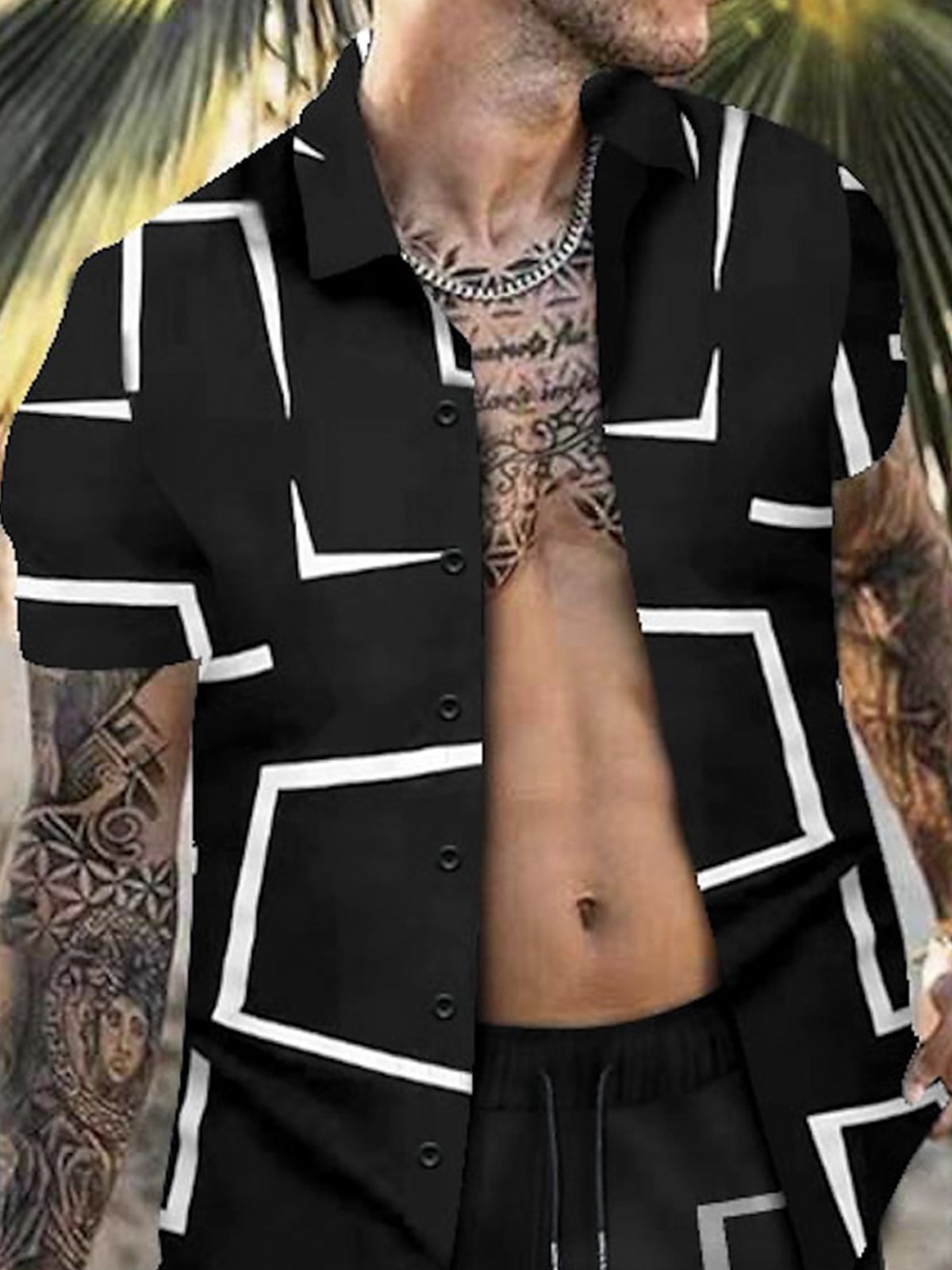 Royaura Beach Vacation Geometric Art Men's Hawaiian Outfit Stretch Plus Size Aloha Pool Shirts