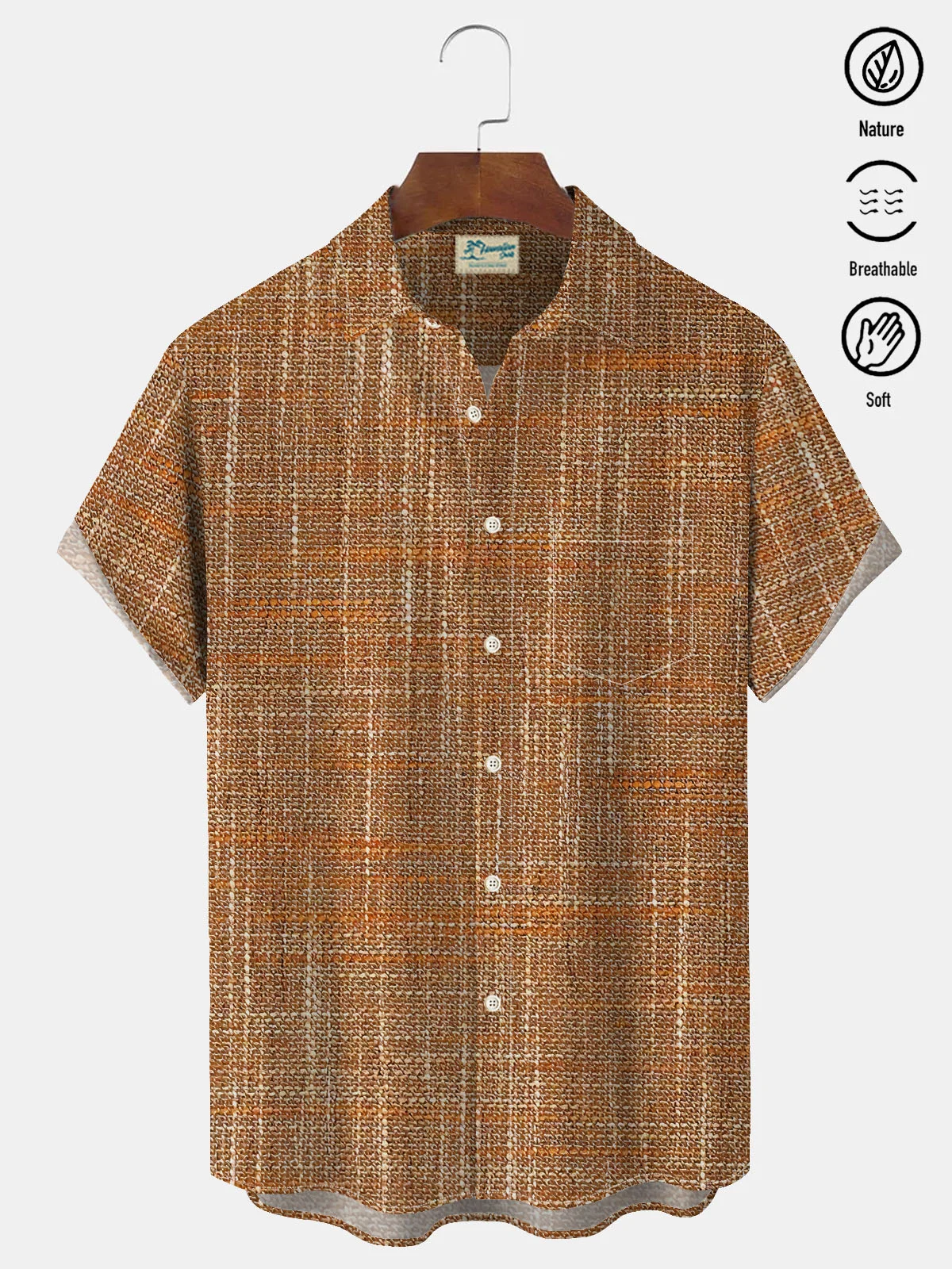Royaura® Cotton Linen Brown Textured Print Men's Button Pocket Short Sleeve Shirt