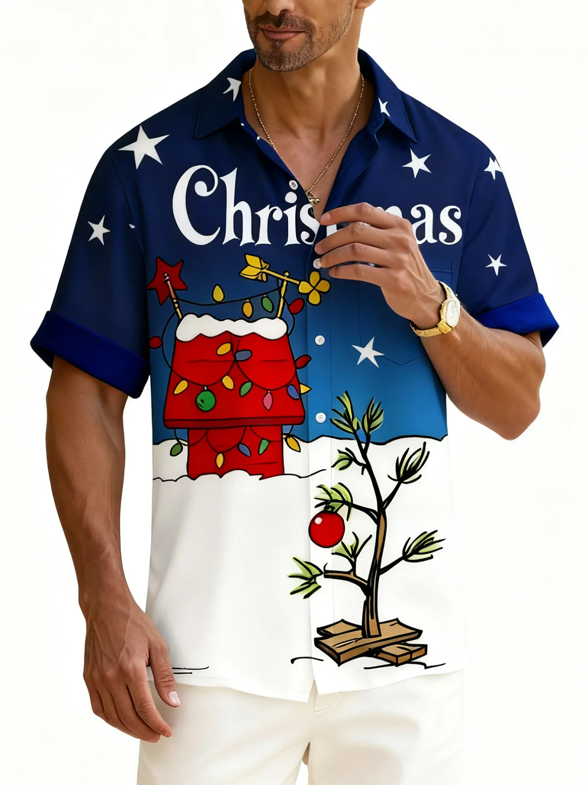 Royaura Christmas Holiday Blue Men's Shirts Cartoon Art Christmas Tree Lights Stretch Pocket Hawaiian Shirts Big Tall
