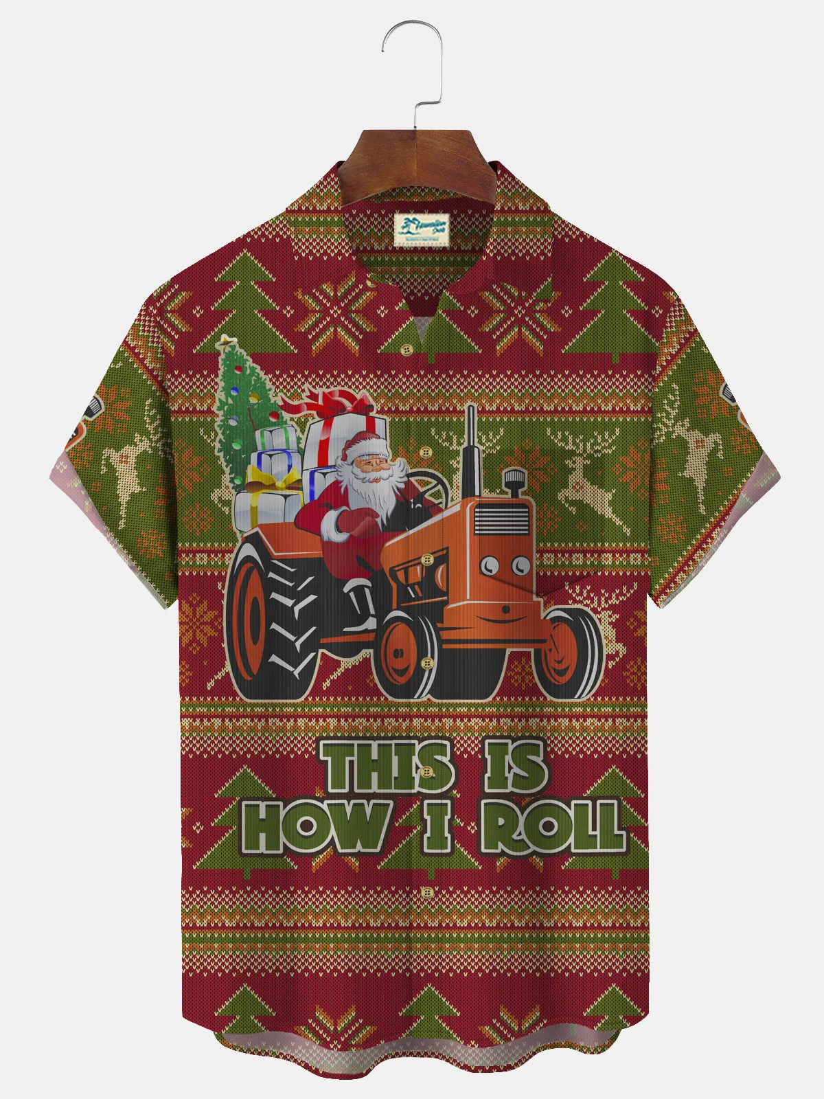 Royaura Christmas Holiday Red Men's Casual Shirts Santa Truck Textured Print Stretch Plus Size Aloha Camp Pocket Button-Down Shirts