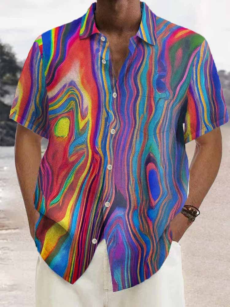 Royaura® Cotton Linen Comfortable hemp Men's Casual Gradient Print Front Button Soft Breathable Chest Pocket Casual Hawaiian Shirt