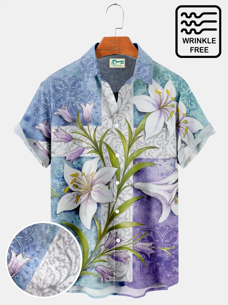 Royaura Easter Lily Cross Print Vacation Beach Hawaiian Oversized Aloha Wrinkle-Free Shirt