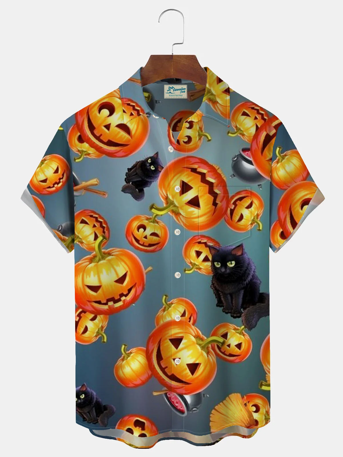 Royaura Halloween Pumpkin Cat Print Men's Button Pocket Short Sleeve Shirt