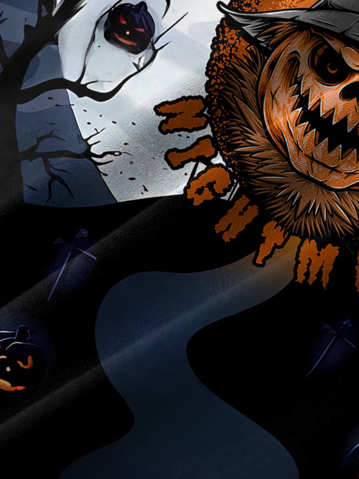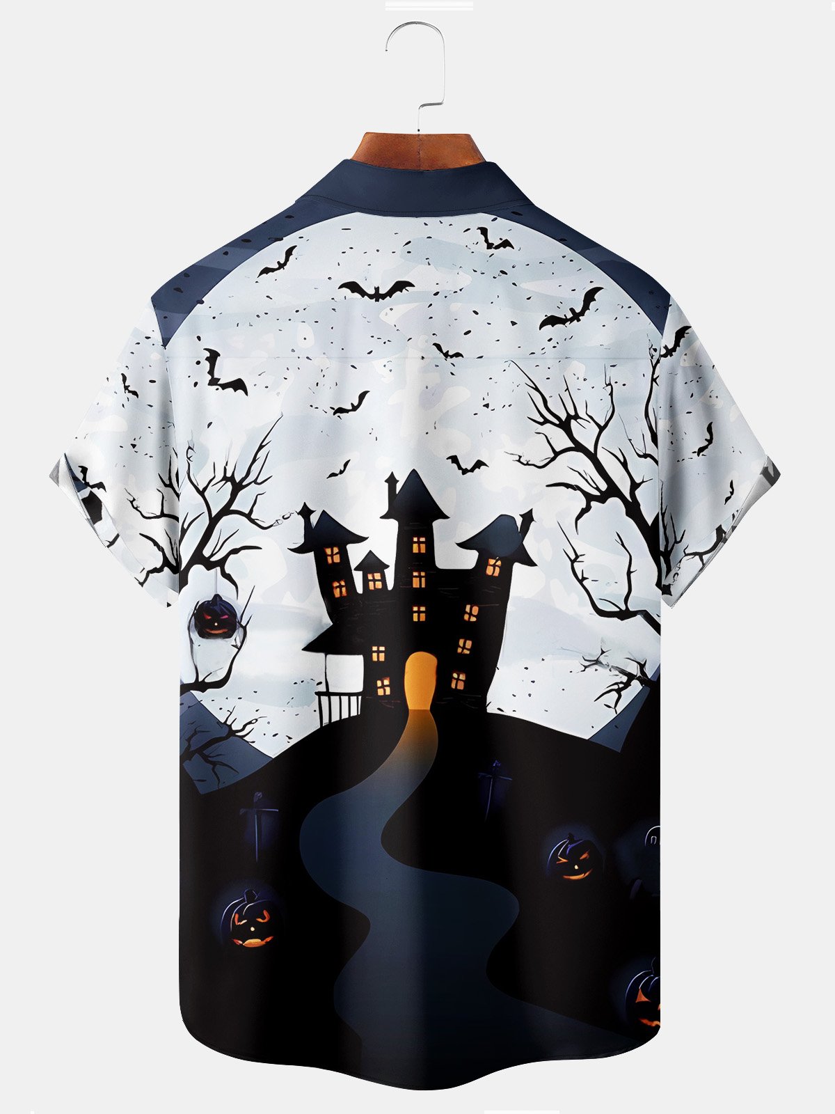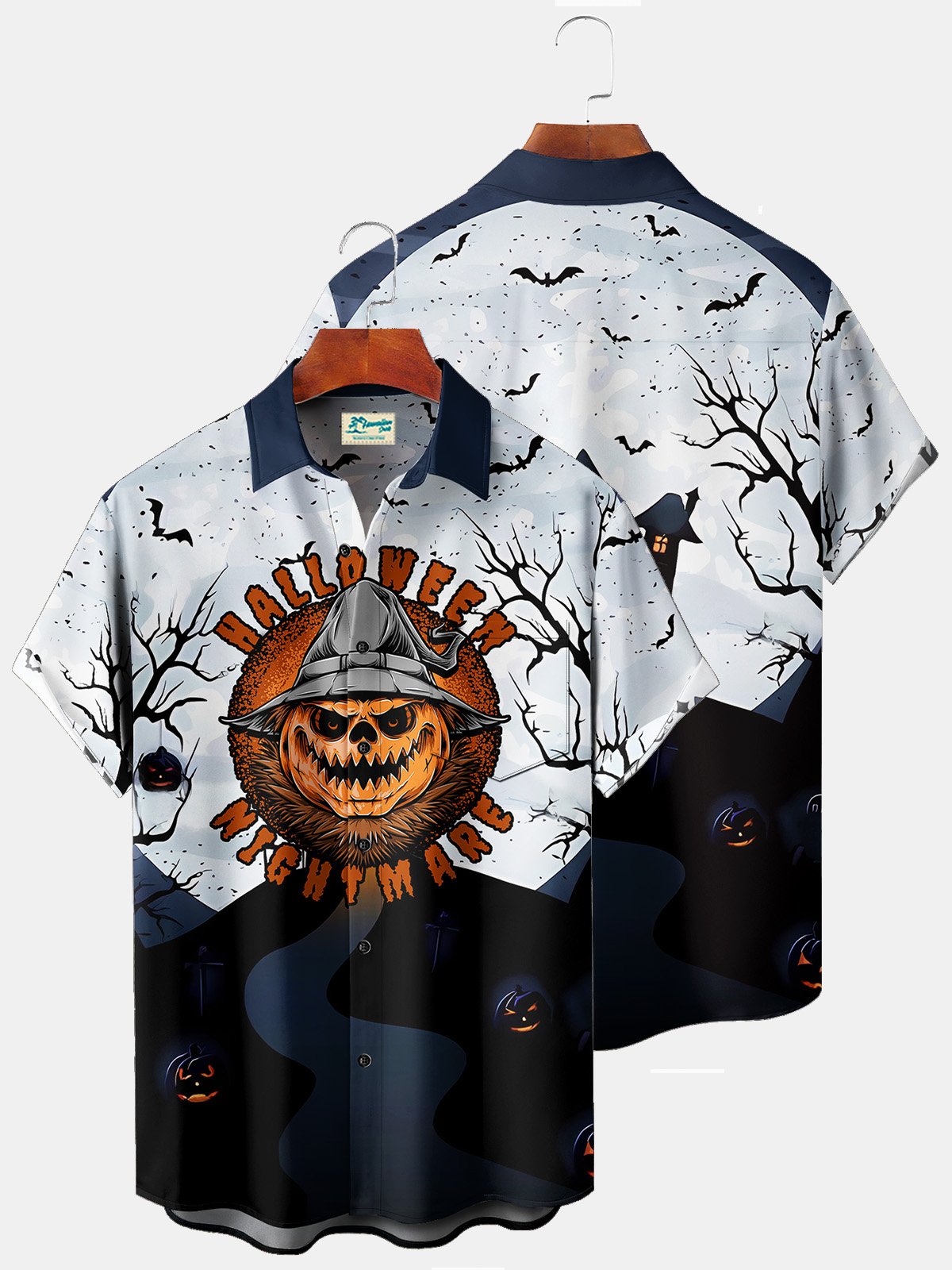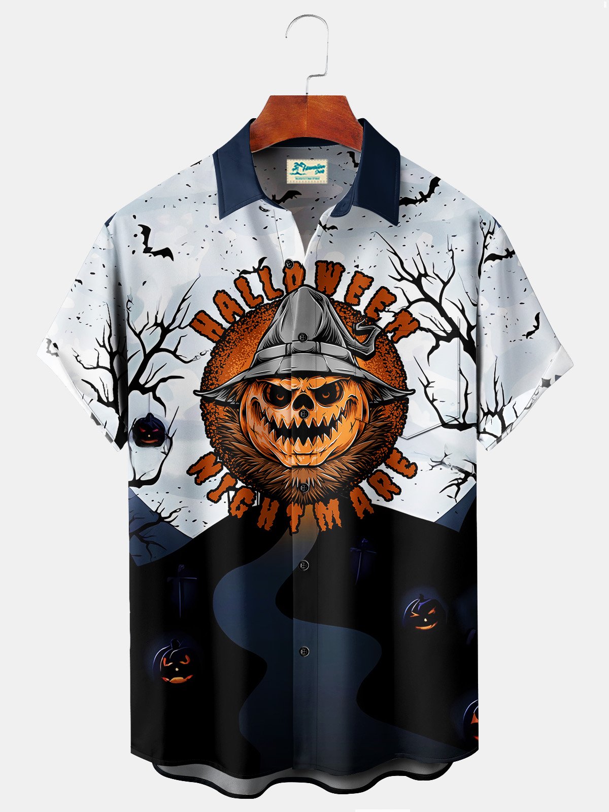 Royaura Halloween White Men's Hawaiian Shirts Pumpkin Monster Bat Stretch Plus Size Aloha Camp Button-Down Shirts