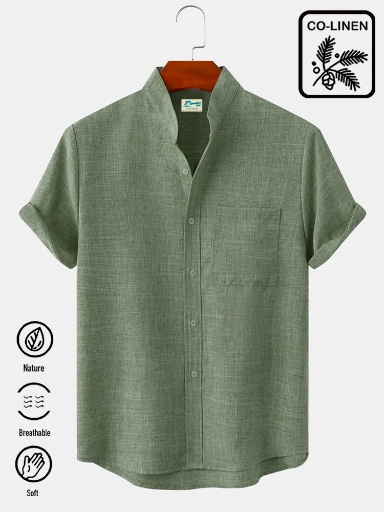 Royaura® Cotton Linen Men's Casual Natural Fiber Stand Collar Soft & Breathable Short Sleeve Shirt