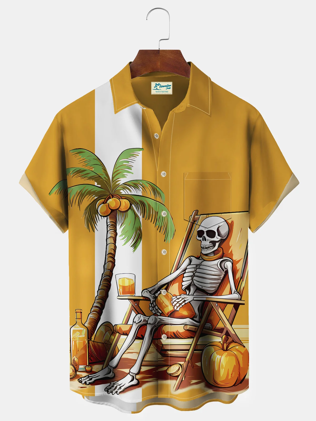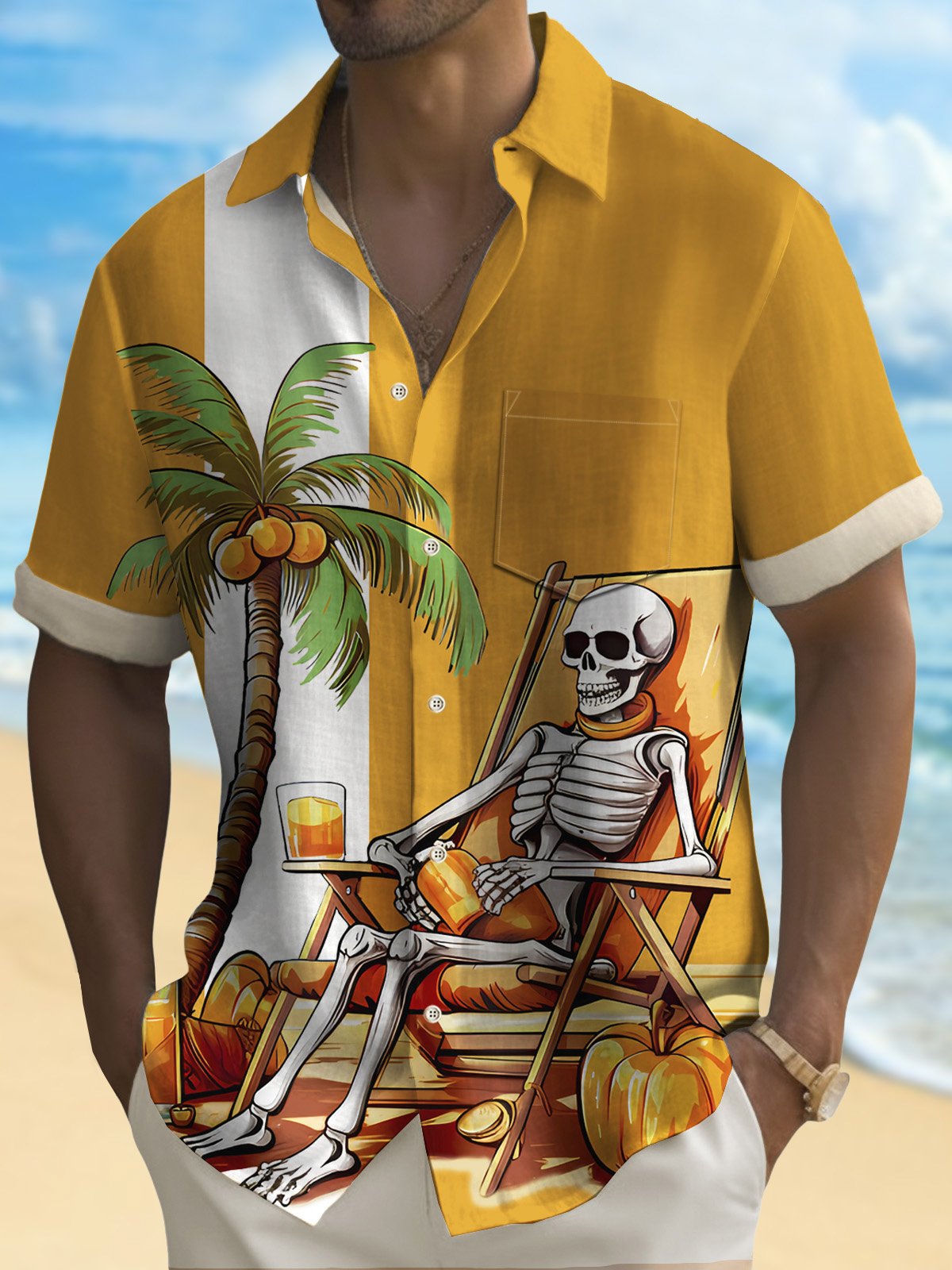 Royaura Men's Halloween Skull Coconut Tree Print Button Pocket Shirt