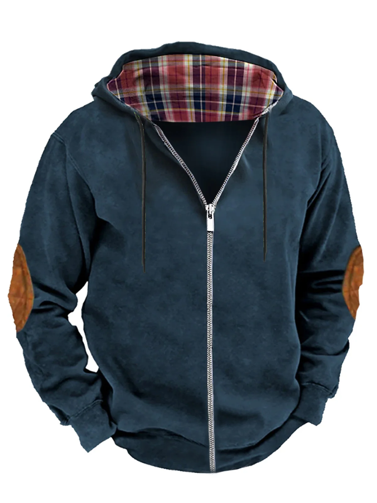 Royaura Men's Plaid Print Drawstring Hooded Zipper Sweatshirt
