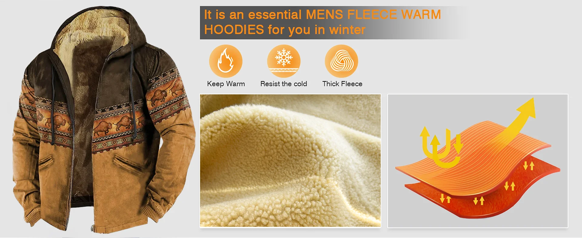 Royaura Vintage Aztec Khaki Men's Drawstring Hoodies Stretch Warm Fleece Ethnic Geometric Art Pullover Sweatshirts